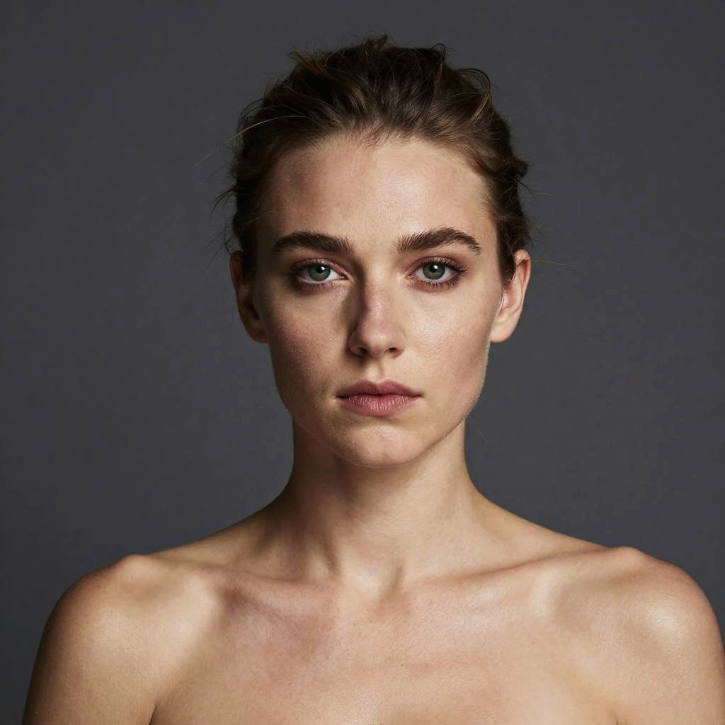 Photograph of a young woman with fair skin, blue eyes, and dark hair pulled back, standing against a dark gray background, topless, displaying