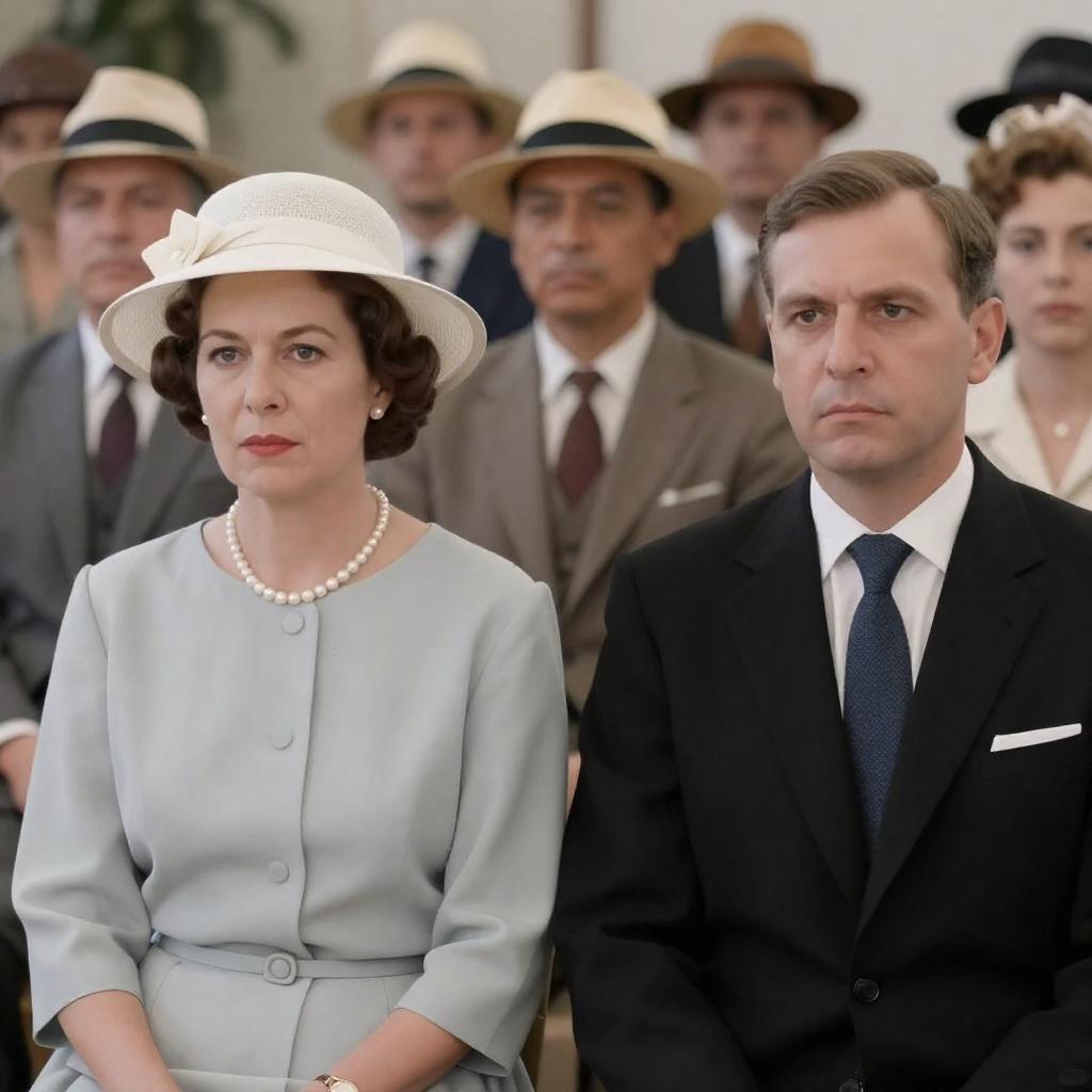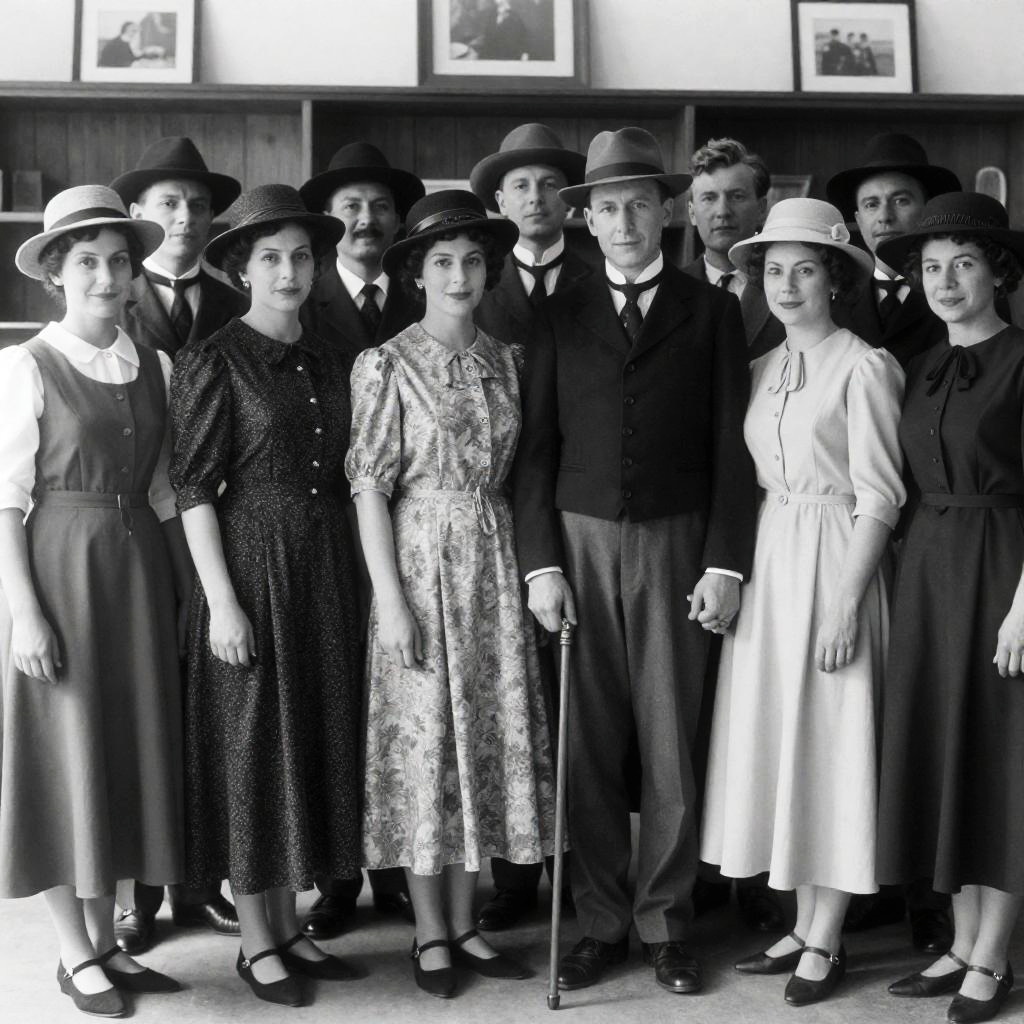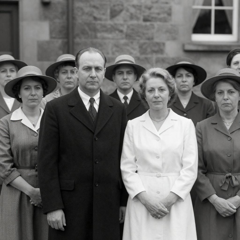 Black-and-white photograph of a group of people standing in front of a stone building. Central couple: man in dark coat, woman in white-collared dress with necklace, hands clasped. Other women wear hats and traditional clothing. Serious expressions. Man on left has receding hairline, woman on right has light-colored hair. Background includes stone walls and window. Group consists of 8 people.