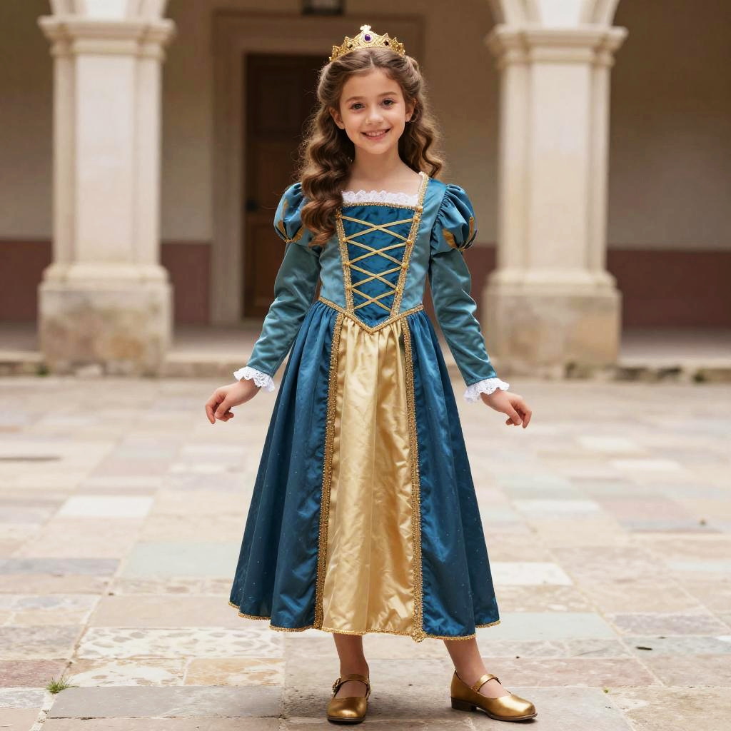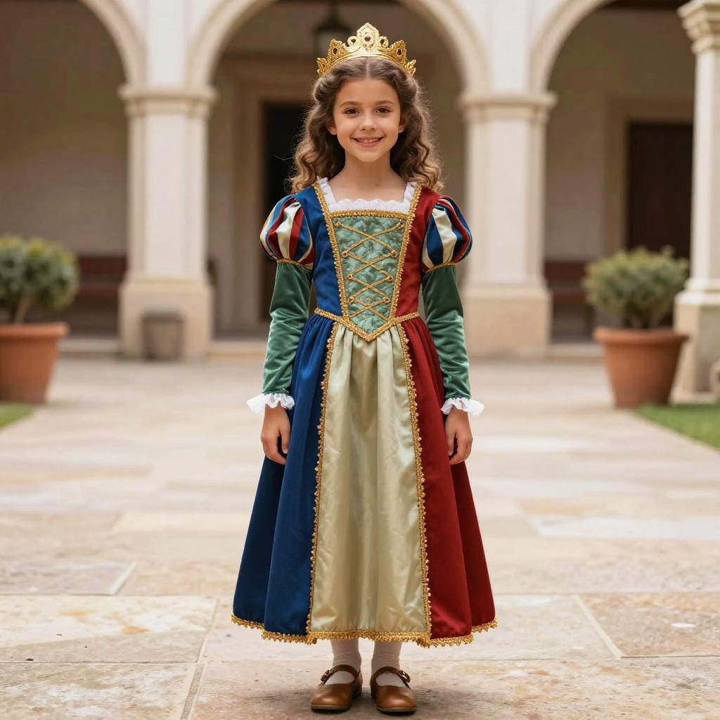 Mirabel Girls Costume, dressed in a renaissance costume standing in a courtyard