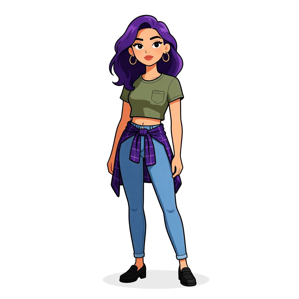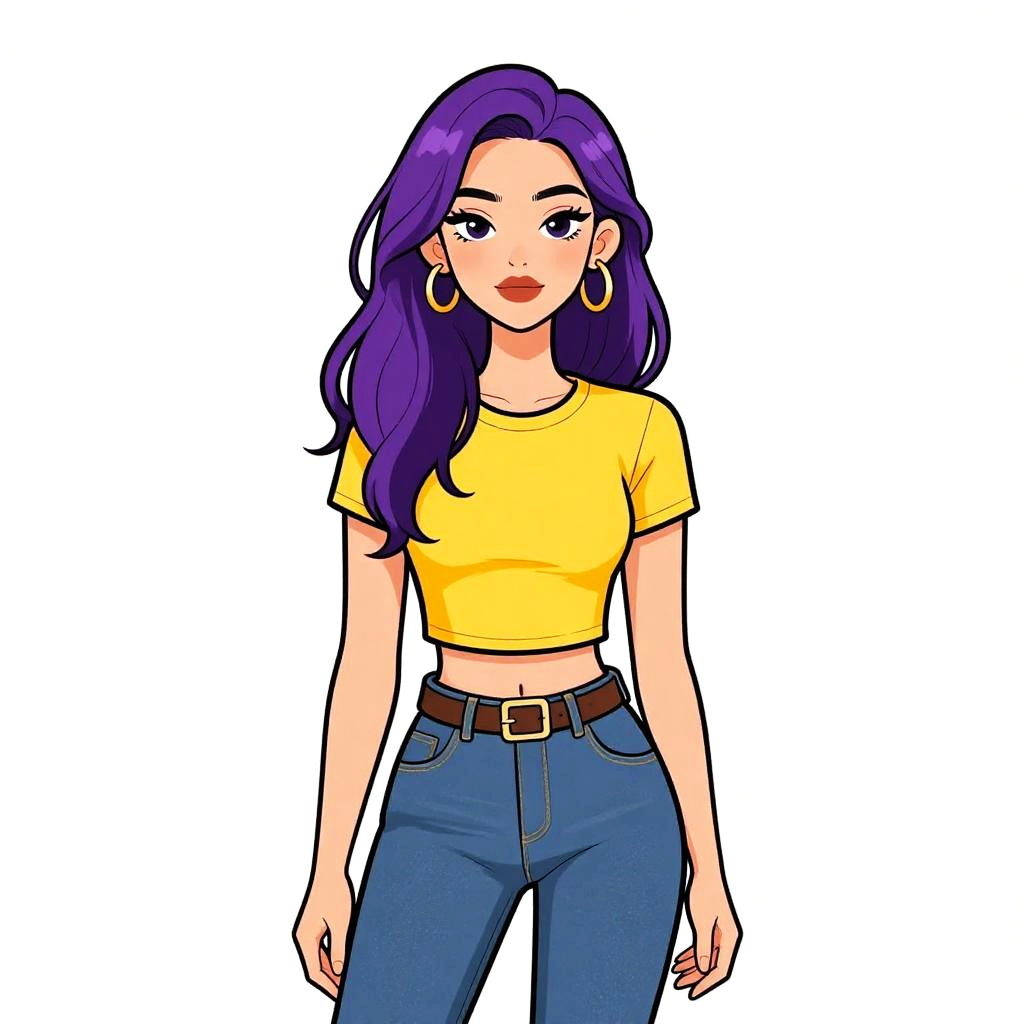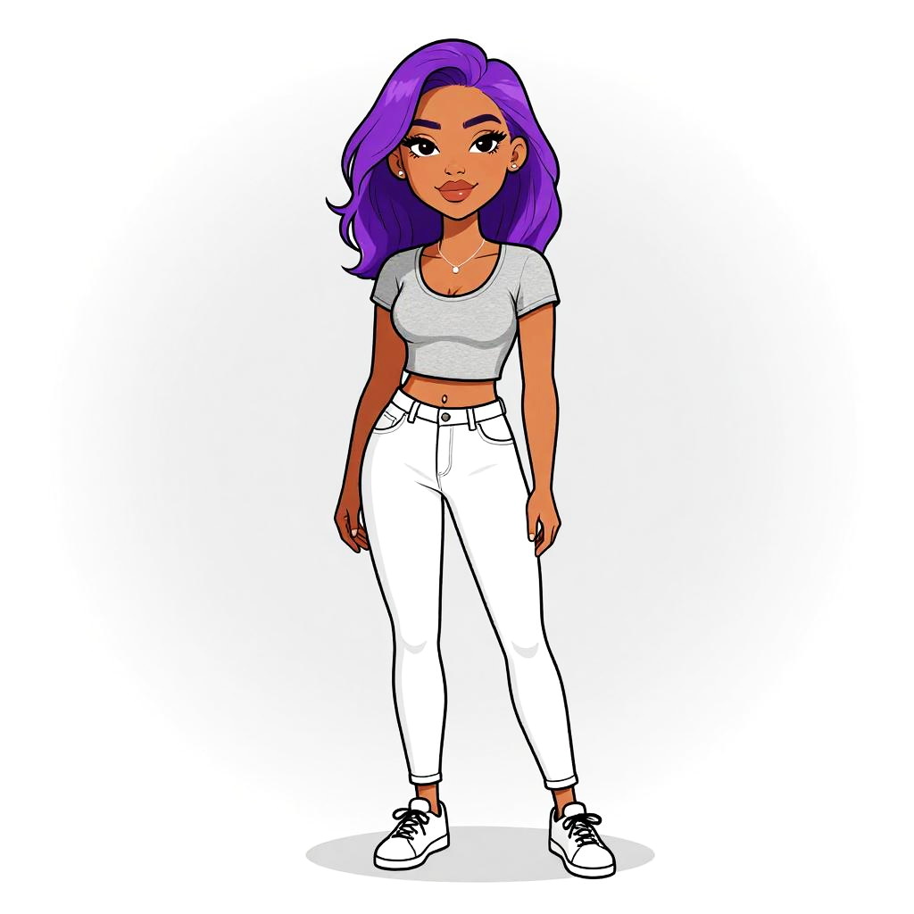 Woman with pretty face and pretty hair. Woman, casual streetwear, fitted gray crewneck T-shirt with rolled-up sleeves, distressed blue denim jeans with a low rise and cuffed hems, white lace-up sneakers, hands casually tucked into front pockets, plain white studio background --sref 1467