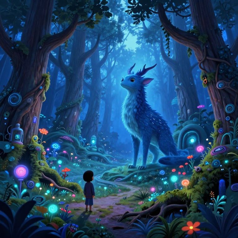 A mesmerizing digital art composition depicts an enchanting garden setting where a majestic mythical creature meanders through a field of giant, luminous fungi in various shades of purple and blue. This whimsical scene is captured from a low-angle viewpoint, intensifying the mystical ambiance surrounding the ethereal being as it moves gracefully among its glowing surroundings. The dreamlike atmosphere created by this fantastical world evokes feelings of wonder, tranquility, and curiosity, inviting viewers to immerse themselves in a realm where reality intertwines with fantasy.