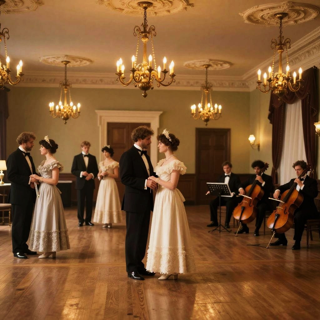 Elegant ballroom from the 1910s with people dressed in Edwardian fashion, chandeliers hanging from ornate ceilings, polished wooden floors, and a live string quartet playing classical music, rich in warm golden hues