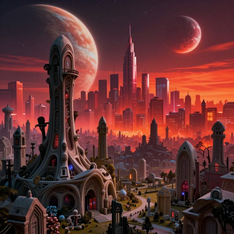 The image presents a surreal, hyper-detailed scene set in a futuristic cityscape. In the foreground, an organic cementery with towering structures and intricate designs stands out, its forms blending with the biomechanic elements of the surrounding architecture. The city is bathed in a vibrant, neon-like glow, with red and orange hues dominating the palette. In the background, a vast, sprawling cityscape stretches out, with towering skyscrapers and sprawling buildings that reach towards the sky. The sky is a stunning display of celestial bodies, including a large, glowing planet and smaller moons, creating a sense of depth and scale. The overall composition is dynamic, with elements arranged in a way that draws the viewer's eye across the scene, from the detailed foreground to the expansive cityscape and beyond. The interplay of colors, textures, and shapes creates a visually rich and immersive experience, capturing the essence of a futuristic, otherworldly environment.