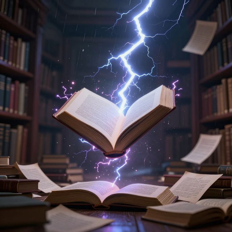 Photograph of an open book emitting vibrant purple lightning, surrounded by floating papers, in a dimly lit, book-filled library.