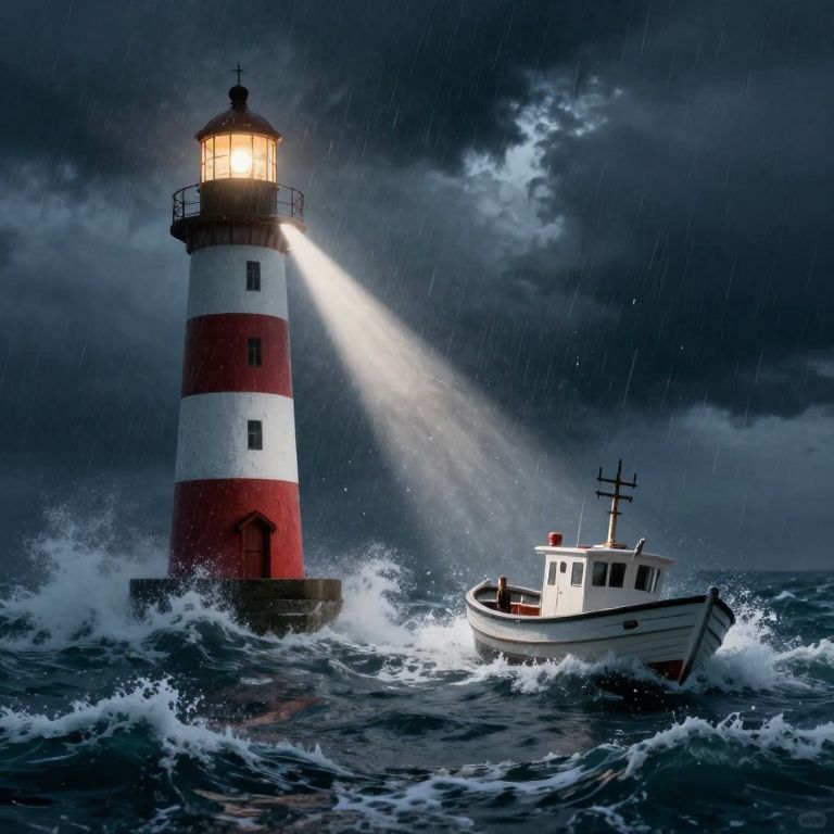 A dramatic depiction of salvatation as a lighthouse piercing through a stormy sea, casting powerful beams of light toward a small boat struggling against crashing waves, symbolizing guidance, safety, and rescue from despair.