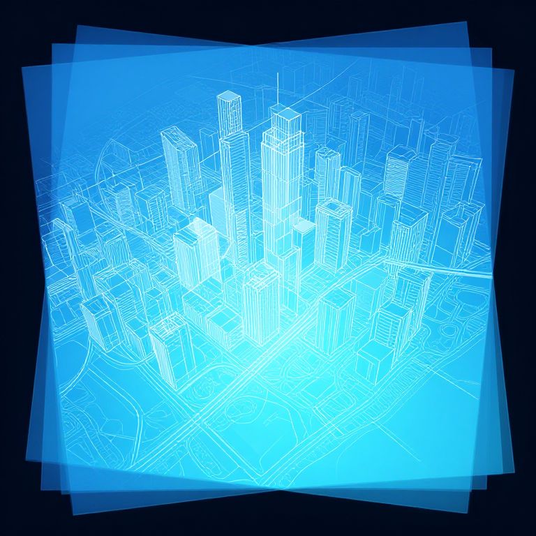 Abstract cityblueprint illustration with layered blueprints overlapping, featuring geometric shapes of city blocks, transit lines, and parks, styled in a minimalist digital art form, with light blue and cyan gradients on a dark background.