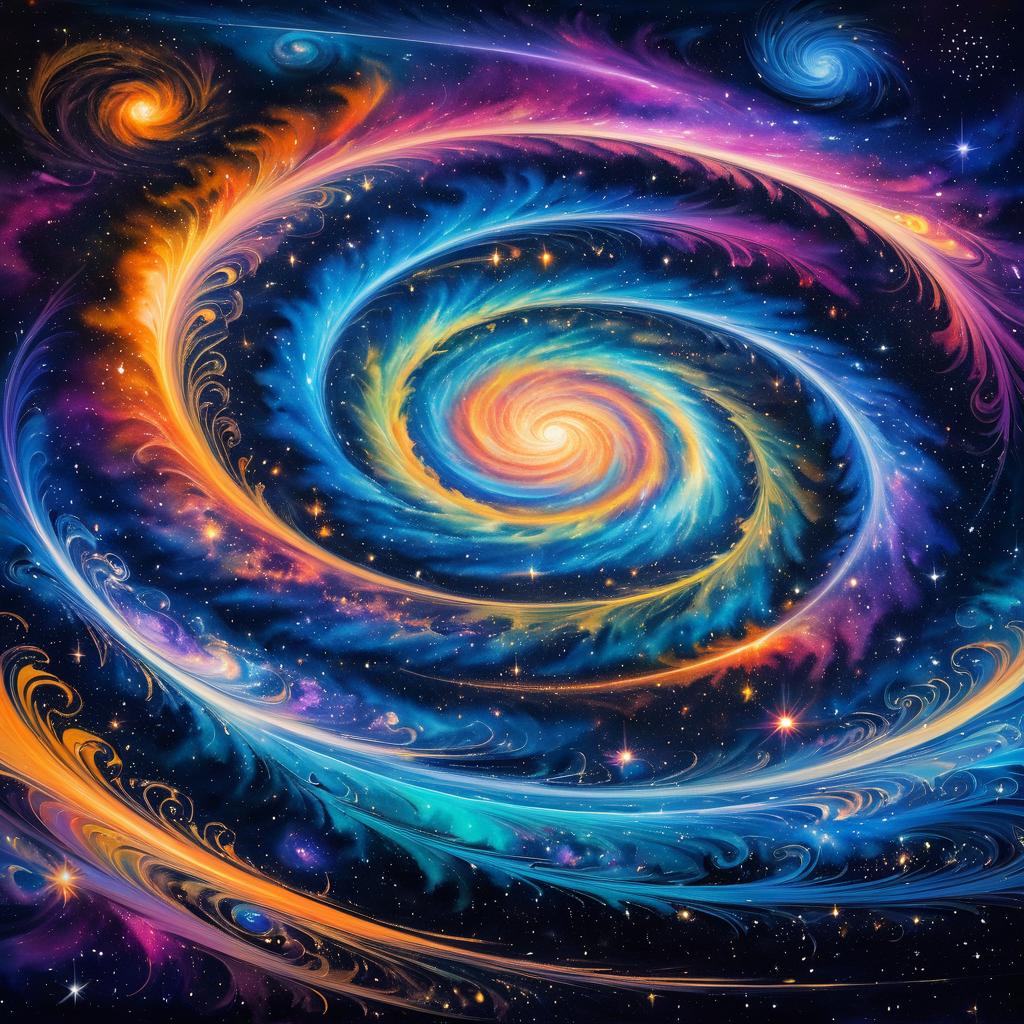 A fantasy painting depicting a swirling galaxy filled with vibrant stars. The image showcases intricate details and vivid colors, including bright yellows, oranges, blues, purples, and pinks, creating a dynamic and mesmerizing cosmic scene.