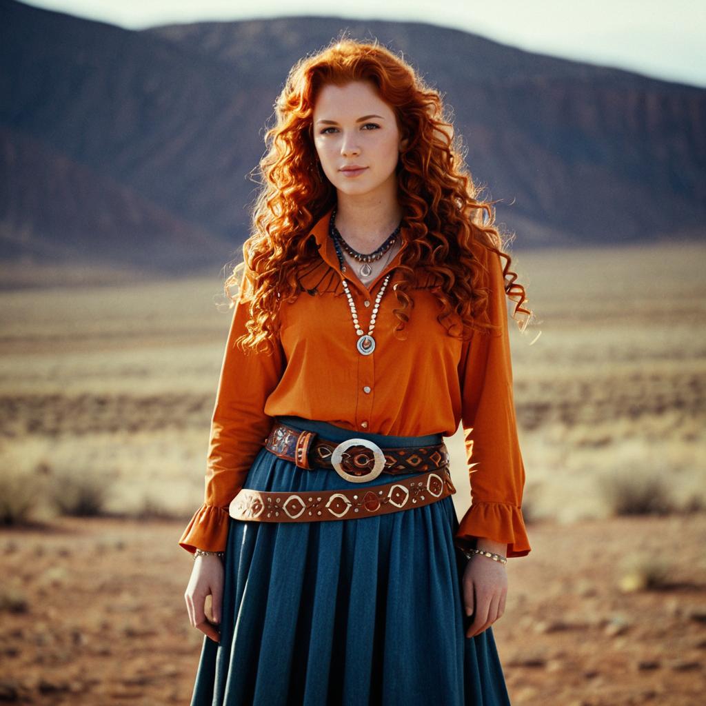 Portrait of a young woman with long curly red hair wearing an orange long-sleeve shirt and blue skirt with decorative belts, accessorized with necklaces and bracelets. She stands outdoors in a desert landscape with blurry mountains in the background, evoking a western or southwestern style.