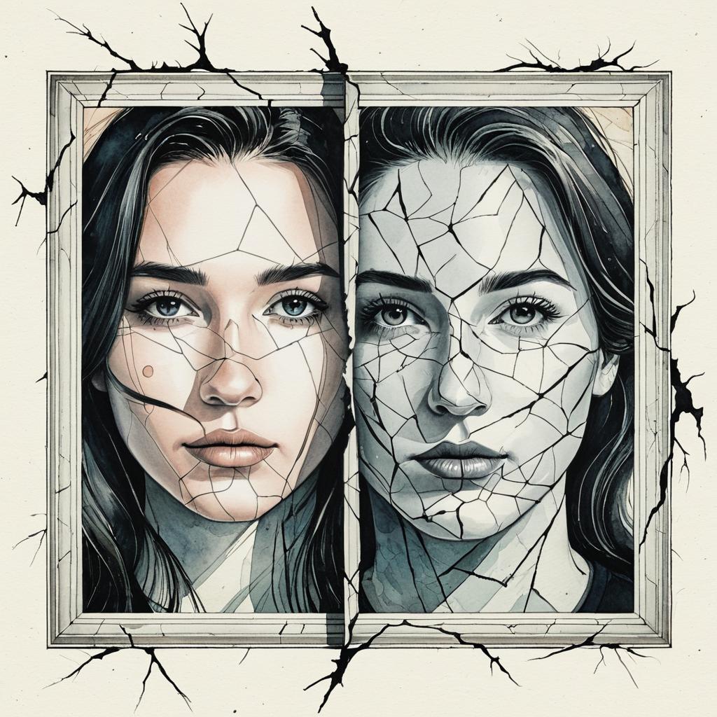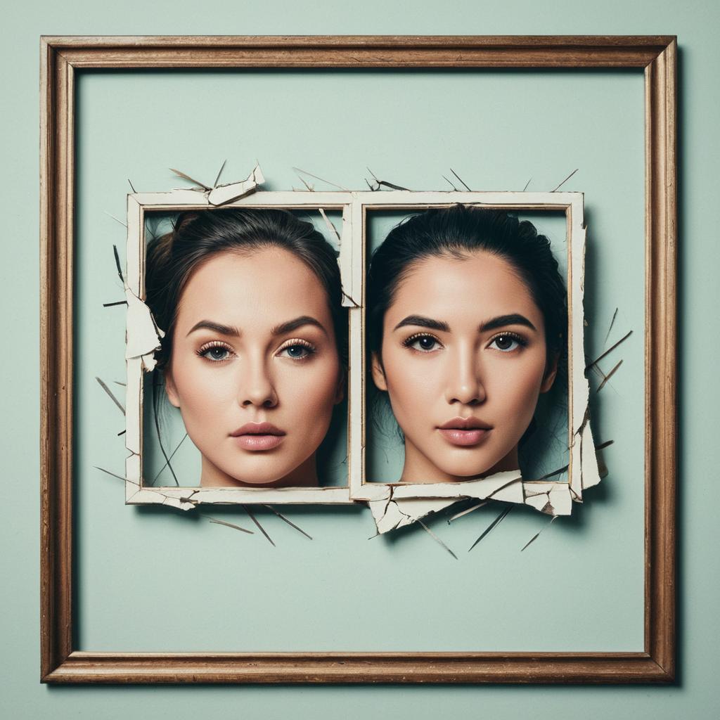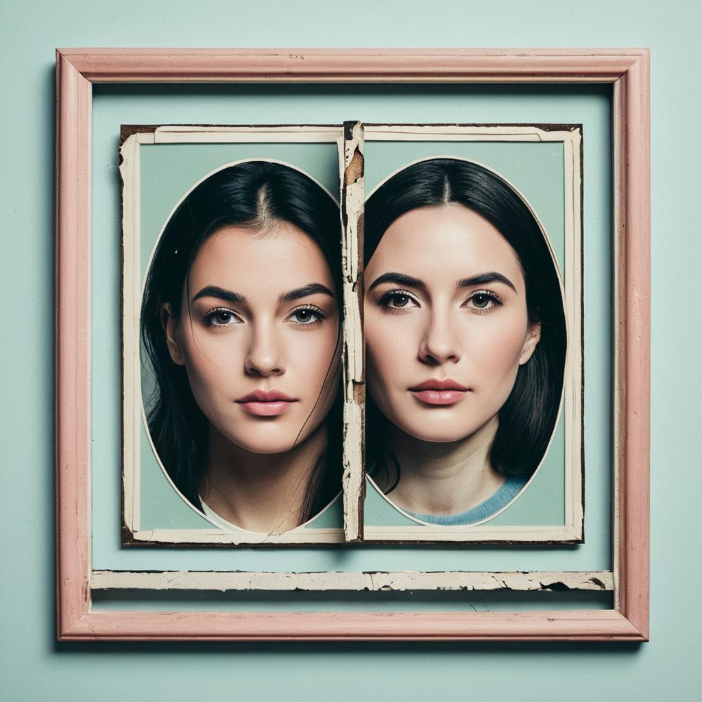 Illustration of two female faces on opposite sides of a broken pastel-colored frame. One face shows a curious, inquisitive expression while the other appears bored and disinterested. Soft pastel shades of blue and peach dominate the design, creating a delicate and introspective atmosphere. The cracked frame symbolizes separation and emotional contrast, emphasizing harmony and tension within the artwork.