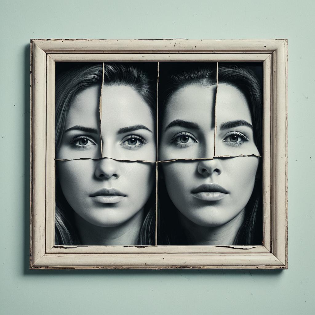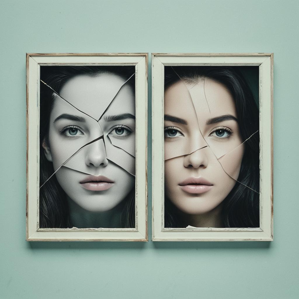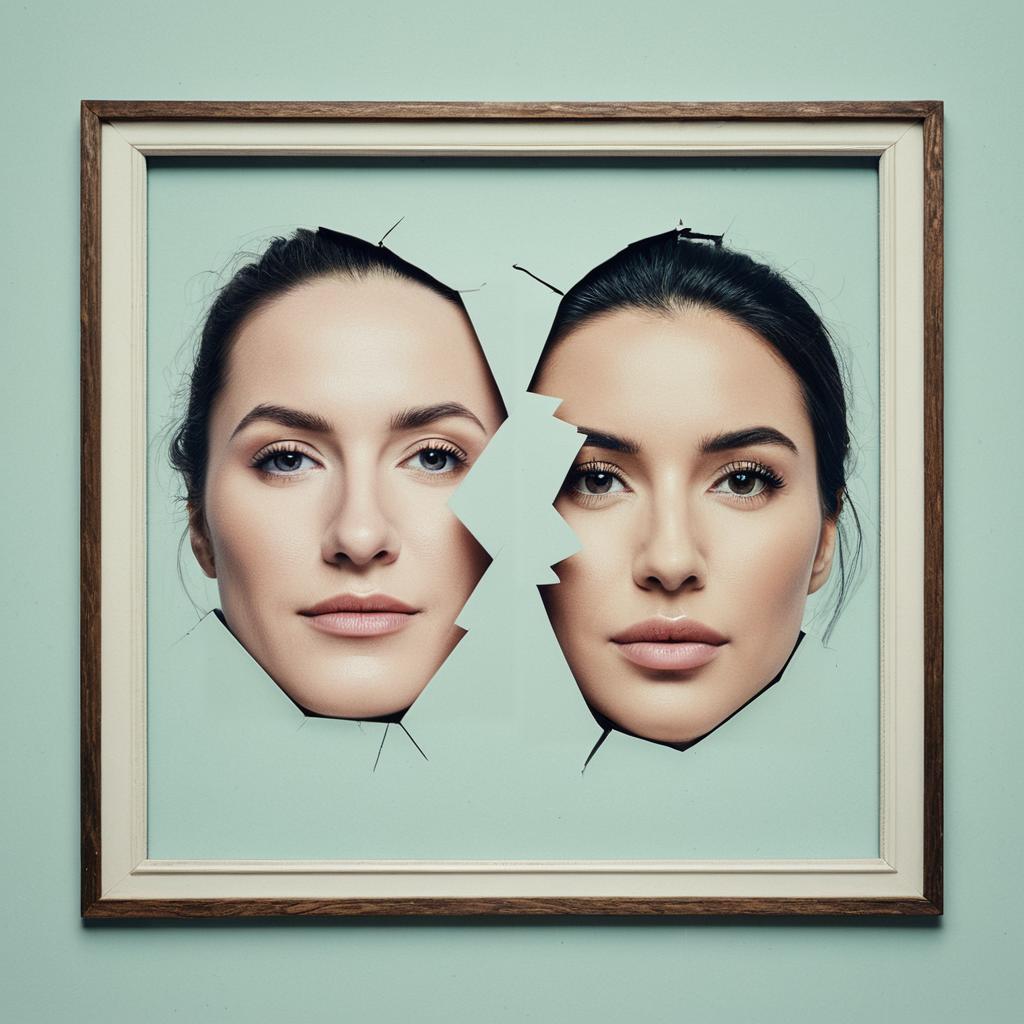 Illustration of two female faces on opposite sides of a broken pastel-colored frame. One face shows a curious, inquisitive expression while the other appears bored and disinterested. Soft pastel shades of blue and peach dominate the design, creating a delicate and introspective atmosphere. The cracked frame symbolizes separation and emotional contrast, emphasizing harmony and tension within the artwork.