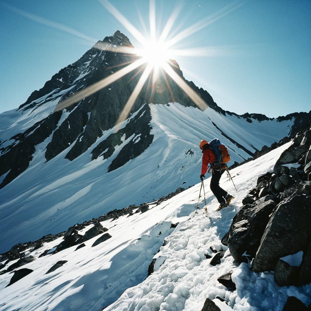 A male mountain climber ascending a steep, snow-covered rocky slope with a bright sun shining in a clear blue sky. The climber is wearing a red jacket, blue helmet, and black pants, equipped with climbing gear and walking poles. The backdrop features a tall, snow-capped mountain peak under sharp sunlight.