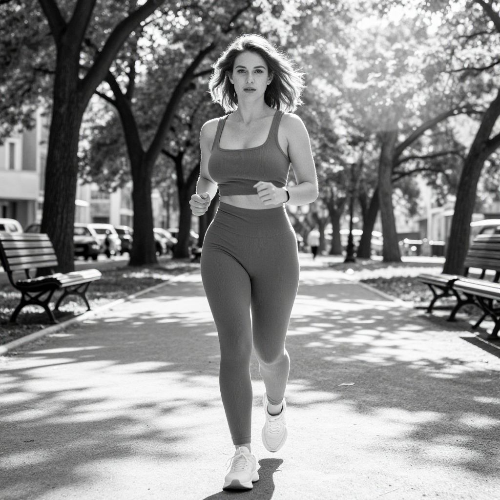 Black-and-white photograph of a fit woman with wavy hair, wearing a sports bra and high-waisted leggings, jogging in a sunlit park