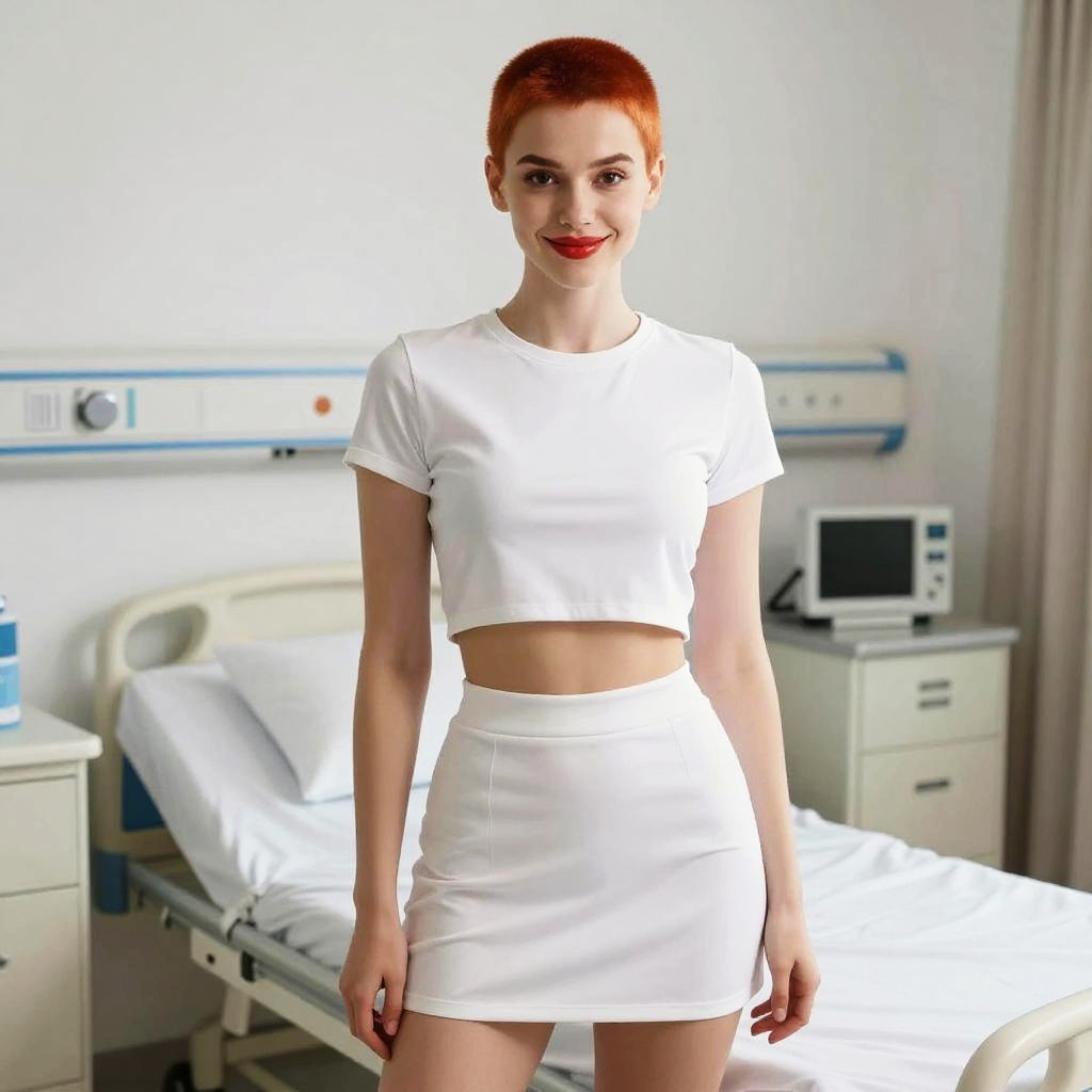 Photorealistic full body shot of a young woman with ginger buzz cut hair, red lips with lip gloss, and fair skin standing in a hospital room. She is wearing a white crop top with underboob visible and a white fitted mini skirt. A hospital bed and medical equipment are visible in the background.