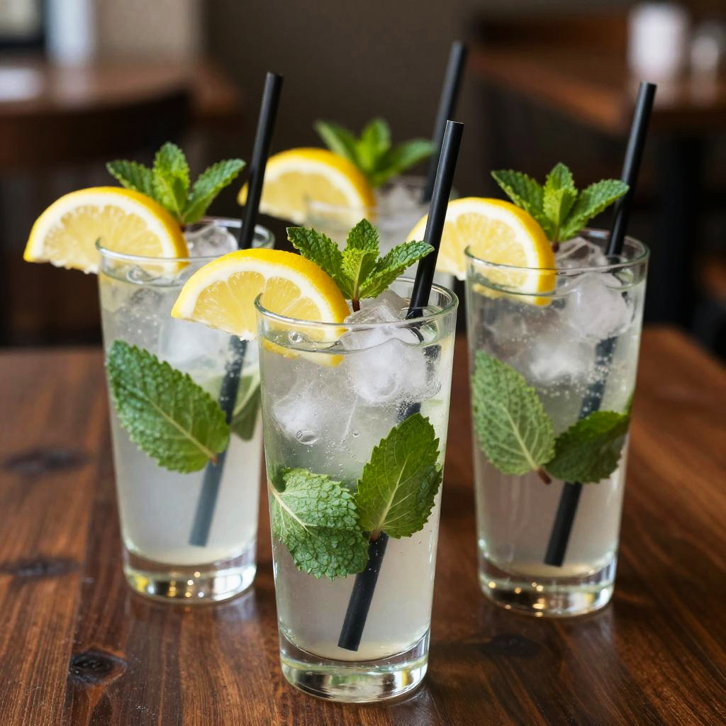 Photograph of four tall, clear glasses filled with ice and fresh green mint leaves, each garnished with a bright yellow lemon slice and a sprig of mint. Black straws are inserted into each glass, standing upright. The glasses are arranged in a slight diagonal line on a dark, wooden table. The background is blurred, highlighting the vibrant colors and refreshing ingredients of the drinks.
