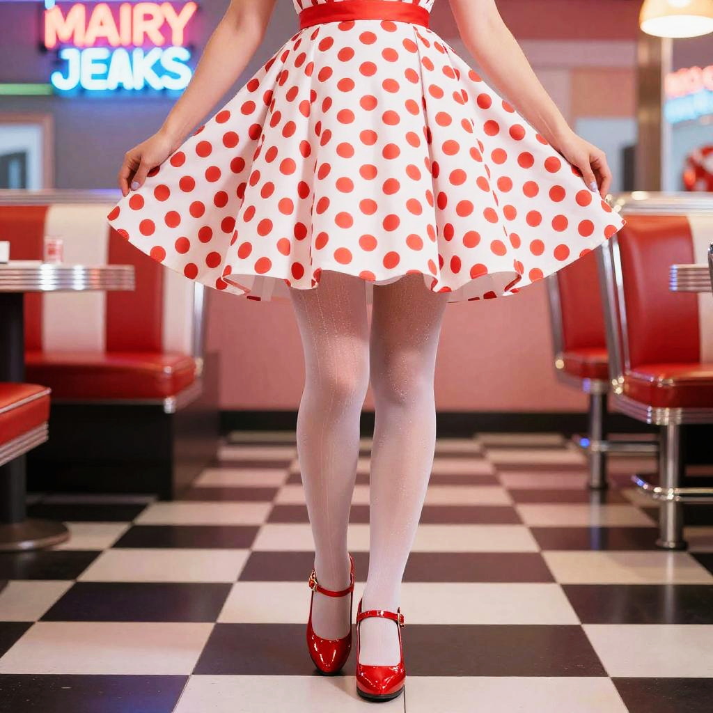 Mary Janes with tights and a retro polka dot dress, 1950s diner setting, vibrant colors, cheerful mood, classic Americana style, glossy shoes and patterned tights, neon signs in background