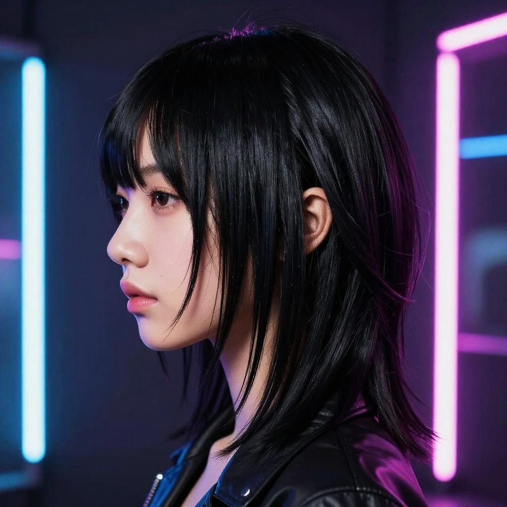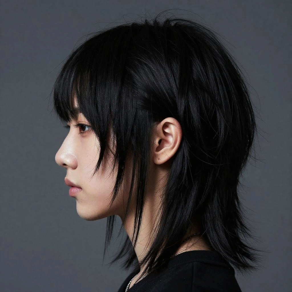 Side profile of a person with black wolf cut, intricate layered hairstyle, moody lighting with shadows highlighting hair texture, cyberpunk aesthetic, high resolution