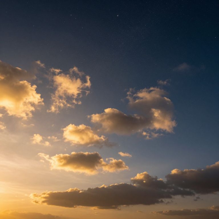 A celestial tapestry of luminous clouds bathed in golden sunlight and studded with twinkling stars defies gravity, creating a surreal, otherworldly horizon where day and night converge in perfect harmony.