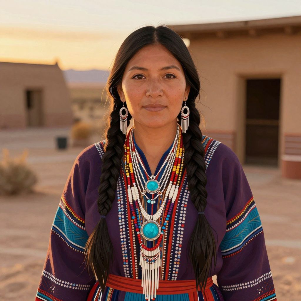 Photograph of a young Indigenous woman with long, straight black hair in two braids, wearing a dark purple traditional dress adorned with intricate, colorful beadwork and turquoise and red accents. She has a medium-brown skin tone and wears large, silver, dangling earrings, and multiple layered necklaces with turquoise and silver details. The background shows a blurred, desert-like setting with a brown building and a sunset sky. The woman's expression is calm and neutral, and the lighting highlights her features and the detailed textures of her attire.