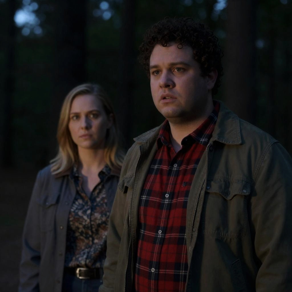 Photograph of two people in a forest at dusk. Foreground man with dark curly hair, medium build, wearing a green jacket and red plaid shirt. Background woman with blonde hair, fair skin, wearing a gray jacket over a patterned shirt. Man looks to the left with a concerned expression. Woman looks slightly forward. Tall trees with dim lighting in the background.