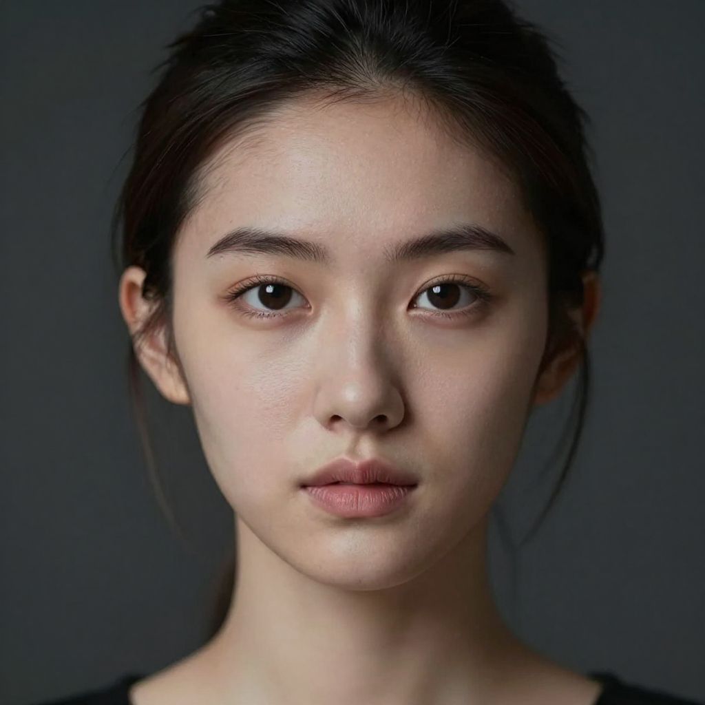 Photograph of an Asian woman with fair skin and dark hair pulled back, facing the camera. She has large, dark brown eyes, thin eyebrows, and full lips with a neutral expression. Her skin has a natural, slightly dewy texture. She wears a black top, visible at the shoulders. The background is a solid, dark gray, which contrasts with her lighter skin and makes her face the focal point. The lighting is soft, highlighting her facial features without harsh shadows. The image has a realistic, studio portrait style.