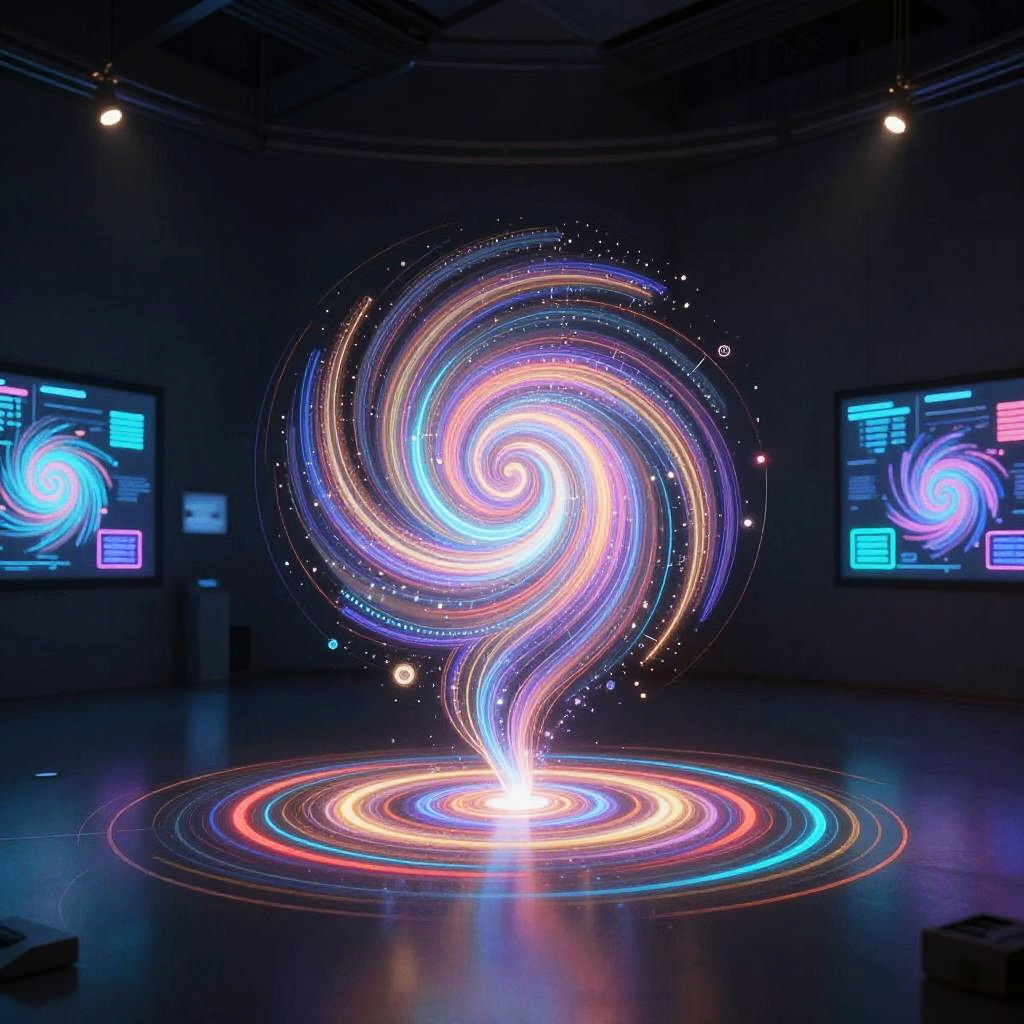 AI drawing prompt: a creative artificial intelligence generating abstract art pieces with swirling patterns of light and color, set in a high-tech gallery filled with interactive digital displays and augmented reality effects.