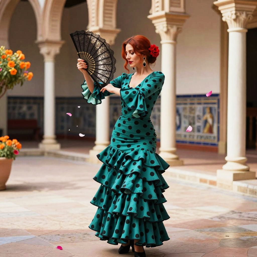 A beautiful woman performing flamenco dance in a sunlit courtyard. She is dressed in a teal dress with black polka dots and multiple ruffled layers. Her red hair is styled with a red flower, and she holds a black lace fan. The background features ornate columns, tiled walls, and bright orange flowers. Pink petals float gracefully around her.