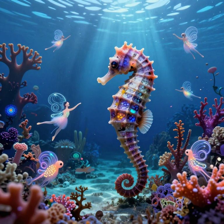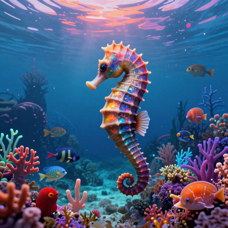 Digital art: Vibrant underwater scene with a detailed, colorful seahorse-adorned castle surrounded by glowing coral reefs and marine life, illuminated by
