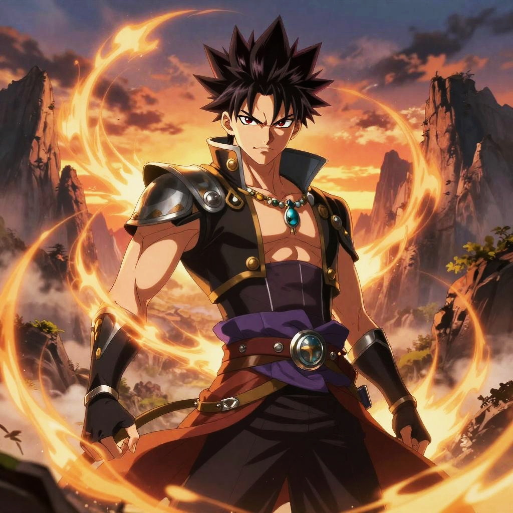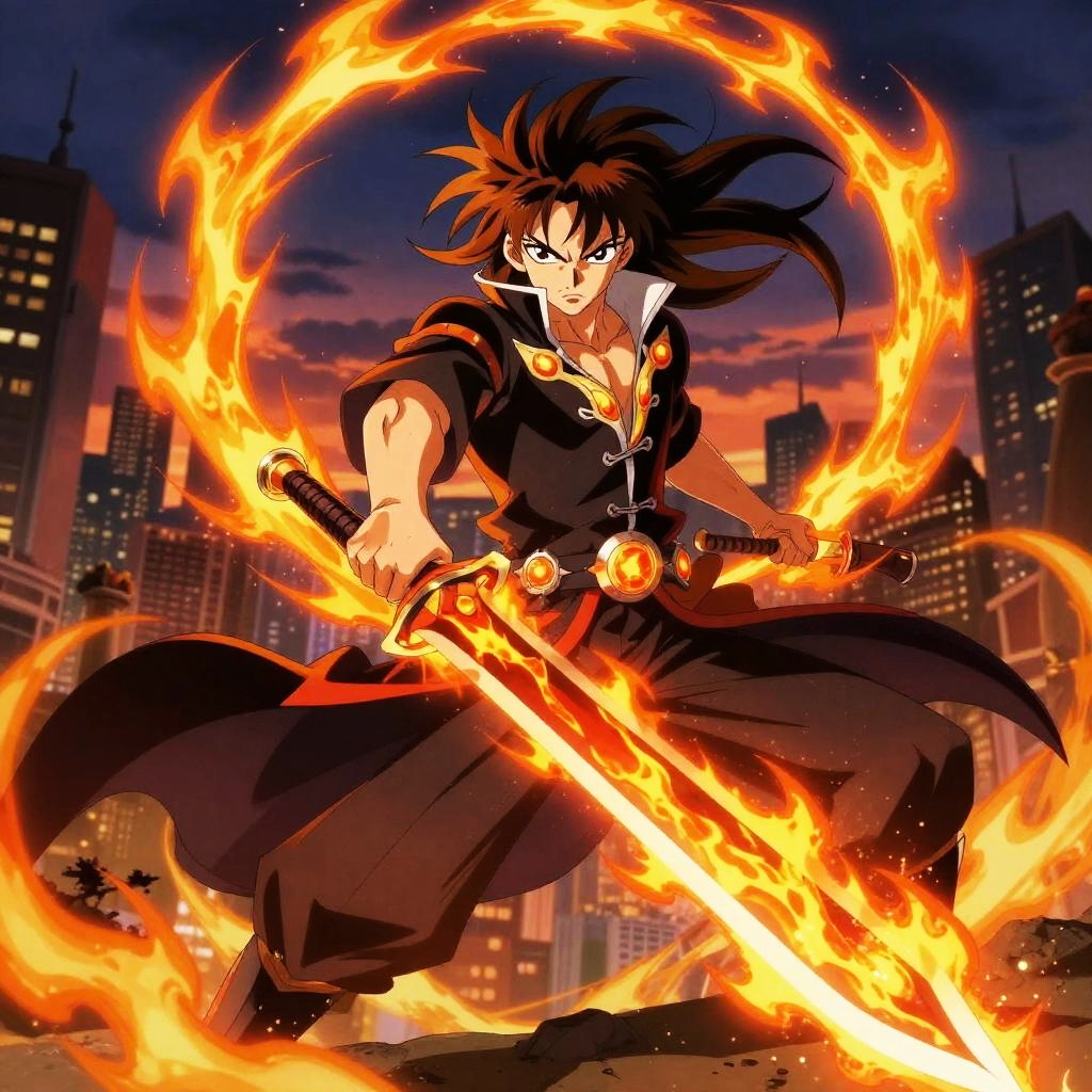 Fiery Anime Warrior with Flaming Swords