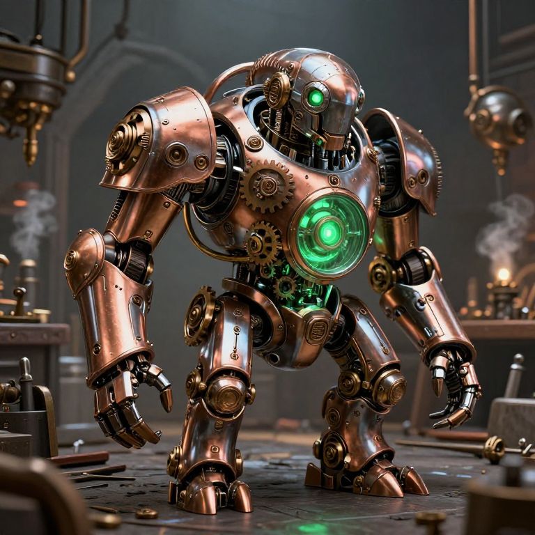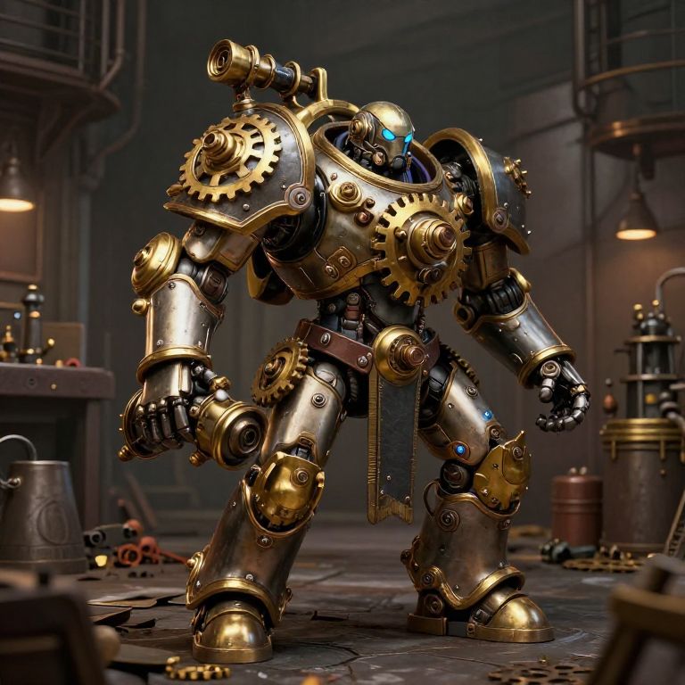 Warriors generator, steampunk style machine crafting armored warriors with brass gears and steam-powered weapons, set in a gritty industrial workshop with rich textures, dramatic shadows, and dynamic poses