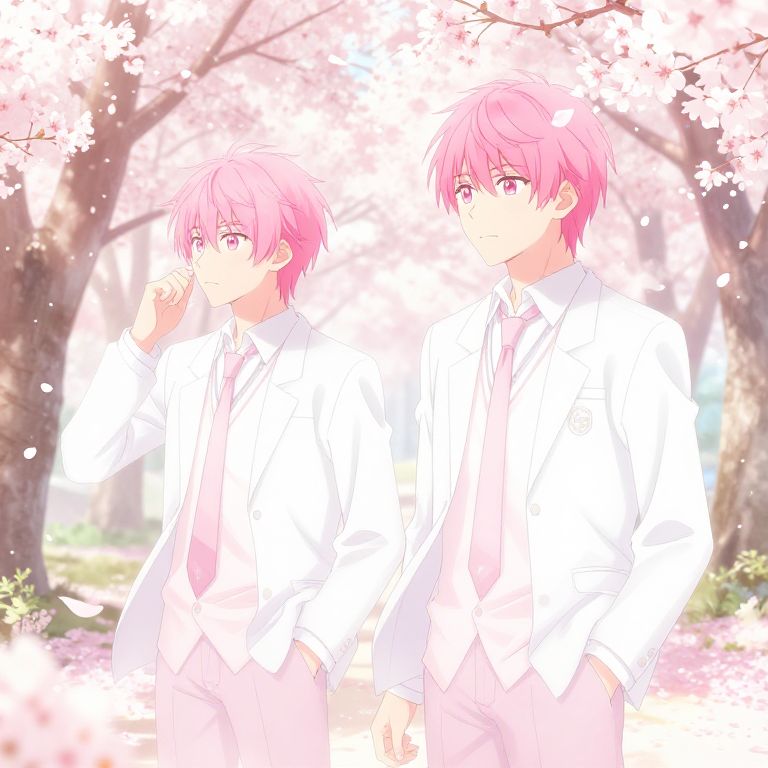 Pink anime boys wearing stylish school uniforms in a cherry blossom park, petals drifting around, soft sunlight filtering through trees, delicate line art, warm color palette dominated by pinks and whites, detailed backgrounds, emotional expressions.
