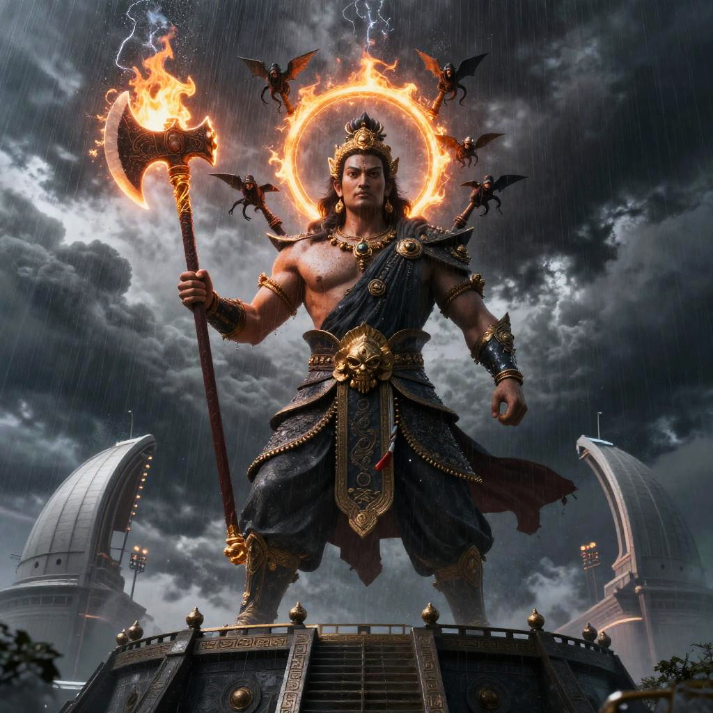 Indra – King of the gods, god of thunder and rain, portrayed as an ancient god encircled by a halo of storm sprites, brandishing a blazing thunder axe, set in the highest celestial observatory peering out into fierce storm clouds.