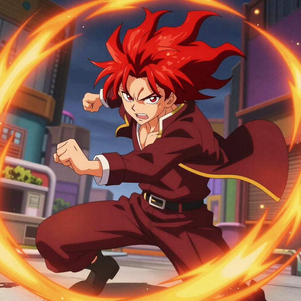 Intense red hair MHA-inspired hero in action pose, mid-battle in a colorful urban setting, fiery red hair blazing with power, dramatic shadows and energy effects surrounding, detailed anime style with expressive eyes and bold costume design.
