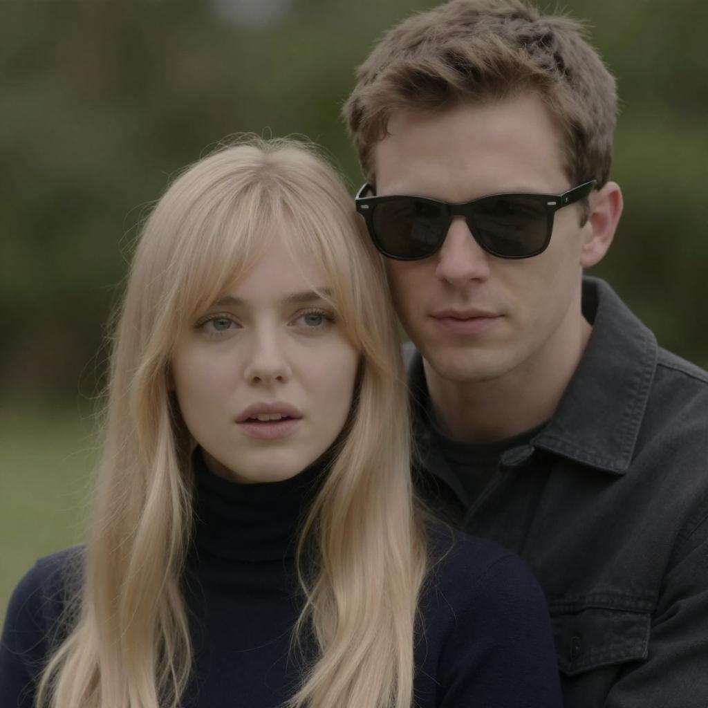 Photograph of two people outdoors. A man with short, spiked blonde hair in a bloody white tank top sits in front, with blood on his chest and arms. A blonde woman with long hair stands behind him, looking intently forward. Both have blood on their faces and clothes. Background includes a grassy area and a blurred vehicle. The woman's arm is around the man's shoulder.