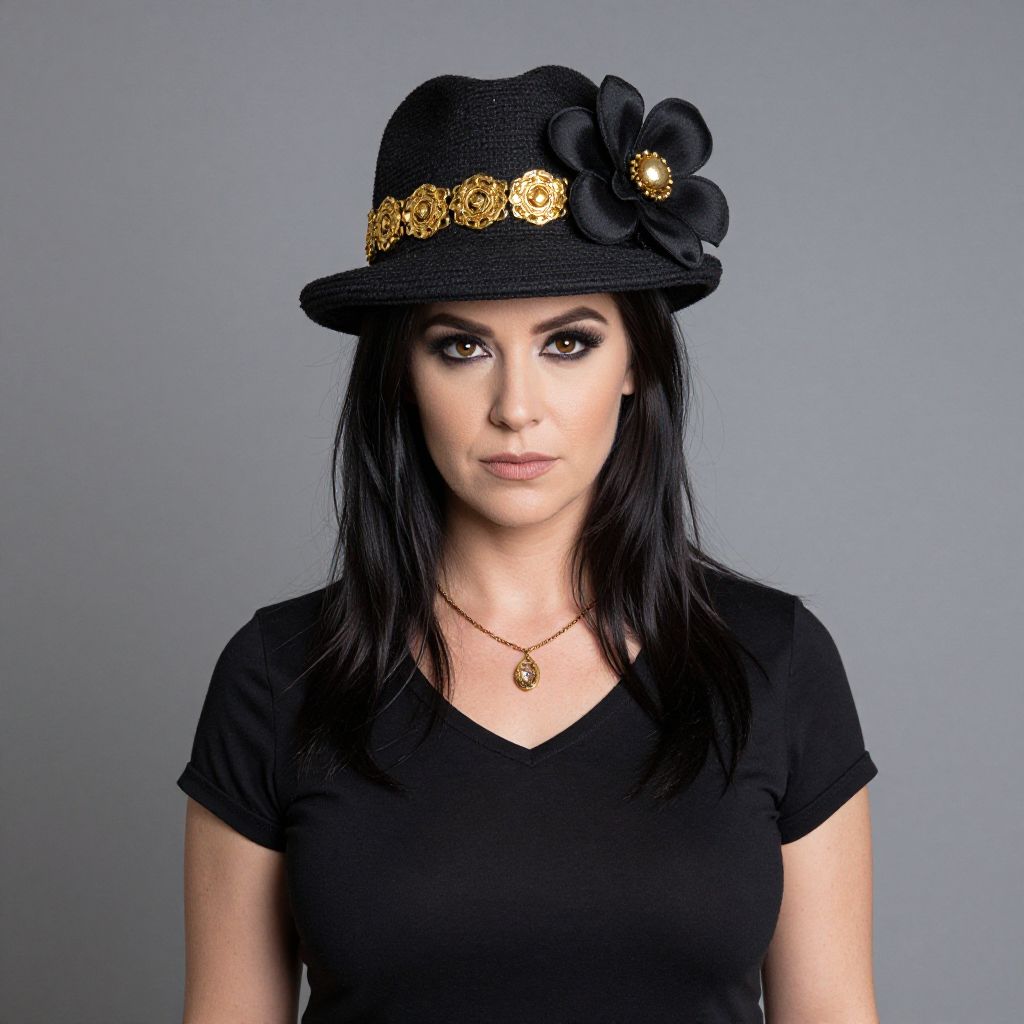 Photograph of a woman with pale skin and dark, straight hair, wearing a black, textured wide-brimmed hat adorned with a large black flower and a row of gold, circular floral embellishments. She has dark, smoky eye makeup and wears a simple black V-neck shirt. A small gold pendant necklace rests on her chest. The background is a solid, light gray, and she gazes directly at the camera with a neutral expression. Her makeup and hat give a vintage, stylish vibe. The image is sharply focused, highlighting the contrast between her black attire and the gold embellishments.