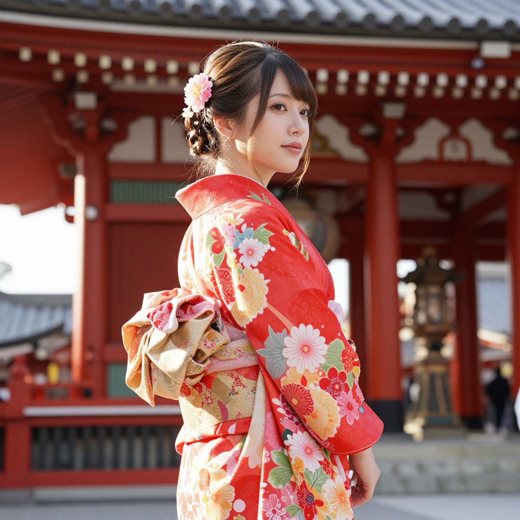 Radiant woman wearing a traditional Japanese kimono adorned with vibrant red floral patterns and complemented by a braided hairstyle decorated with delicate pink flowers, standing gracefully in front of a classic red temple structure.