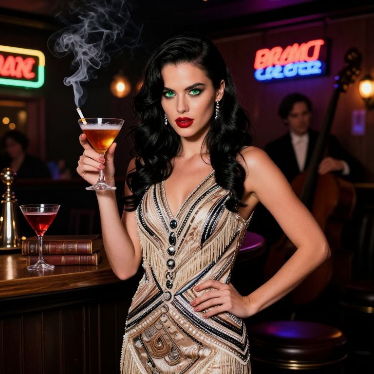 A rebellious Prohibition party girl in her early 20s with long dark wavy hair, sharp angular face, and bold green eyes, dressed in a vintage flapper dress with beaded details and fringe cuffs, standing in a dimly lit speakeasy with neon signs and vintage jazz music playing, surrounded by cocktails, cigarette smoke, and leather-bound books on the shelves, the atmosphere is lively and mysterious with a mix of glamour and underground edge