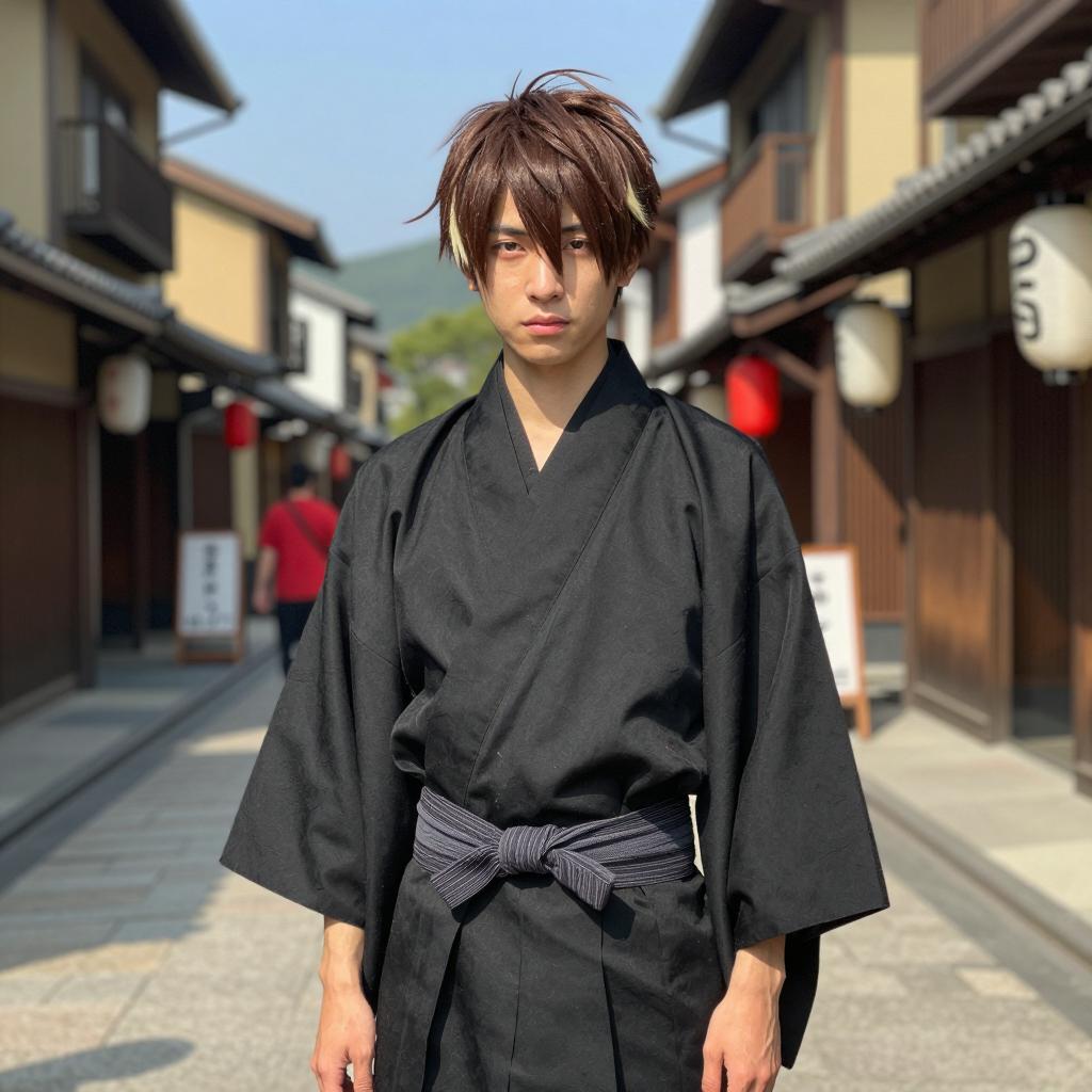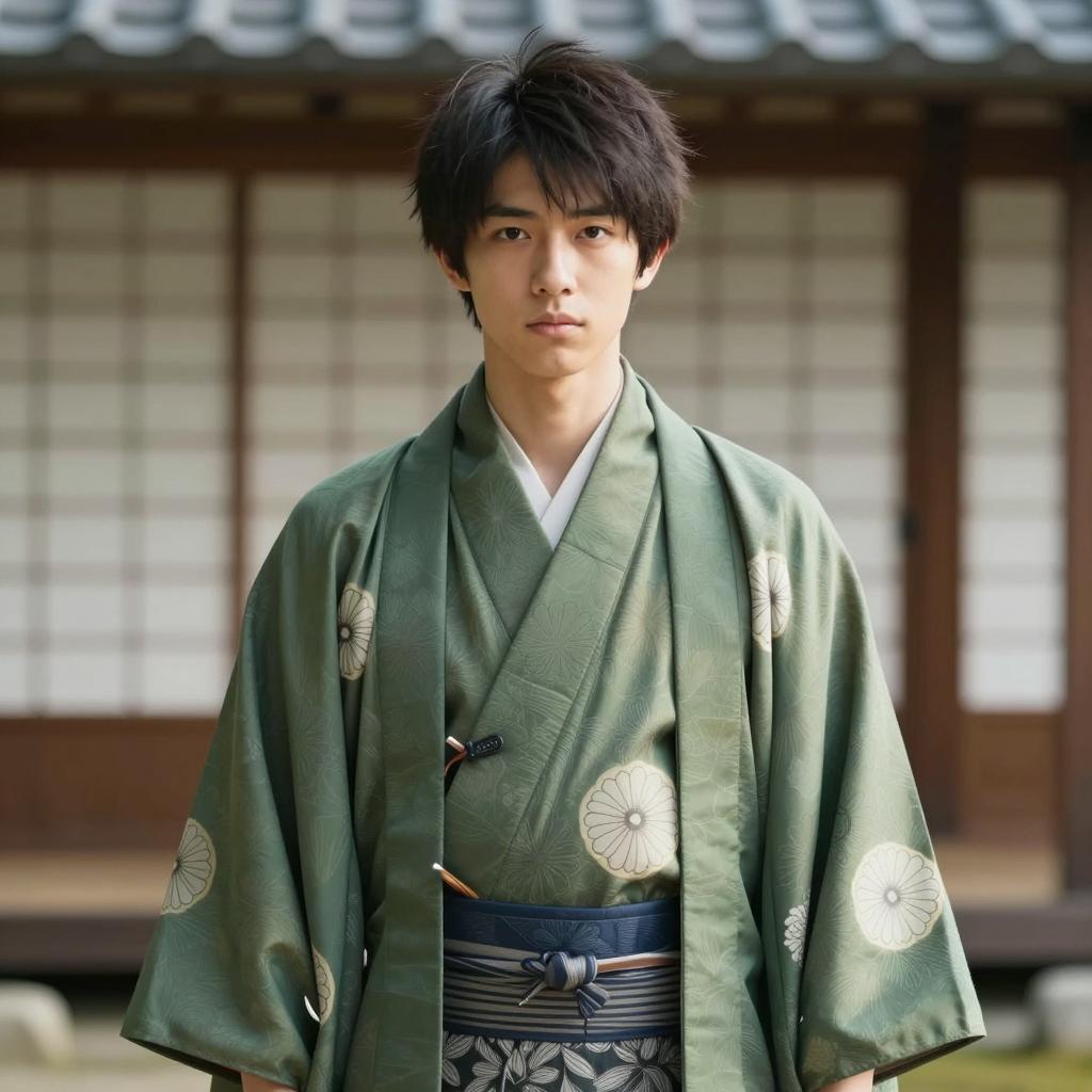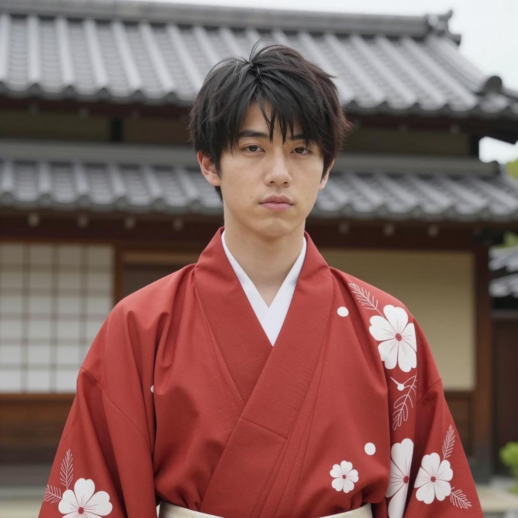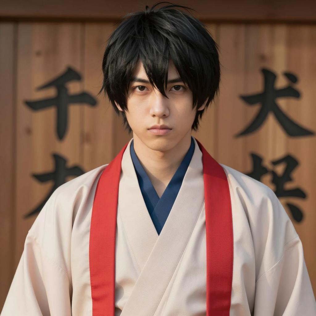 Yuji itadori costume, photograph of young Asian man, medium-length black hair, light skin, wearing traditional Japanese kimono with beige and red fabric, blue trim, standing against wooden background with Japanese characters, soft sunlight, serious expression, close-up, slight shadow on face