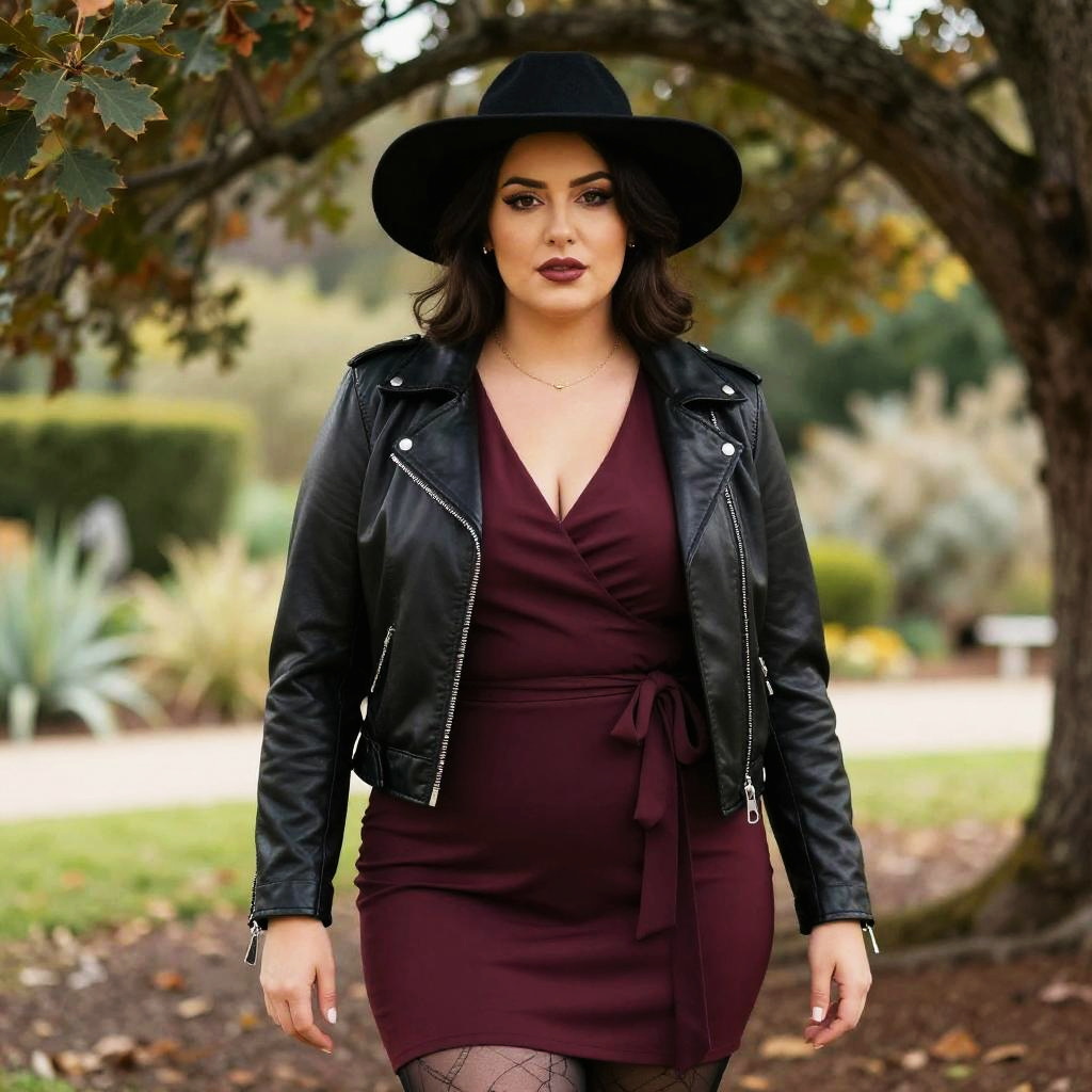 A stocky woman in a kodansha comics style, wearing a burgundy wrap dress with a v-neckline, a black faux leather biker jacket, and sheer black patterned tights, stands in a botanical garden under the oak tree, wide-brimmed black hat perched atop her head, and a simple gold necklace glinting in the sunlight. Sexy. Pretty face and beutiful eyes