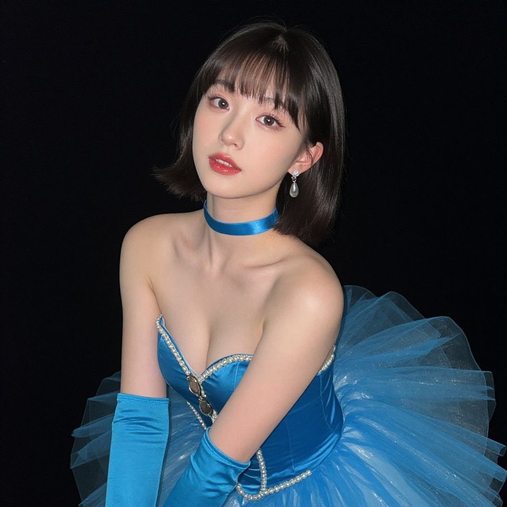 Photograph of an Asian woman with fair skin, straight black bob haircut, and red lipstick, wearing a blue strapless ball gown with a sparkling bodice and a voluminous tulle skirt. She also wears matching blue elbow-length gloves and a blue choker. Her expression is neutral, and she gazes slightly to the right. She has small, dangling earrings. The background is completely black, making her and her blue outfit stand out prominently. The lighting highlights her face and the details of her dress.