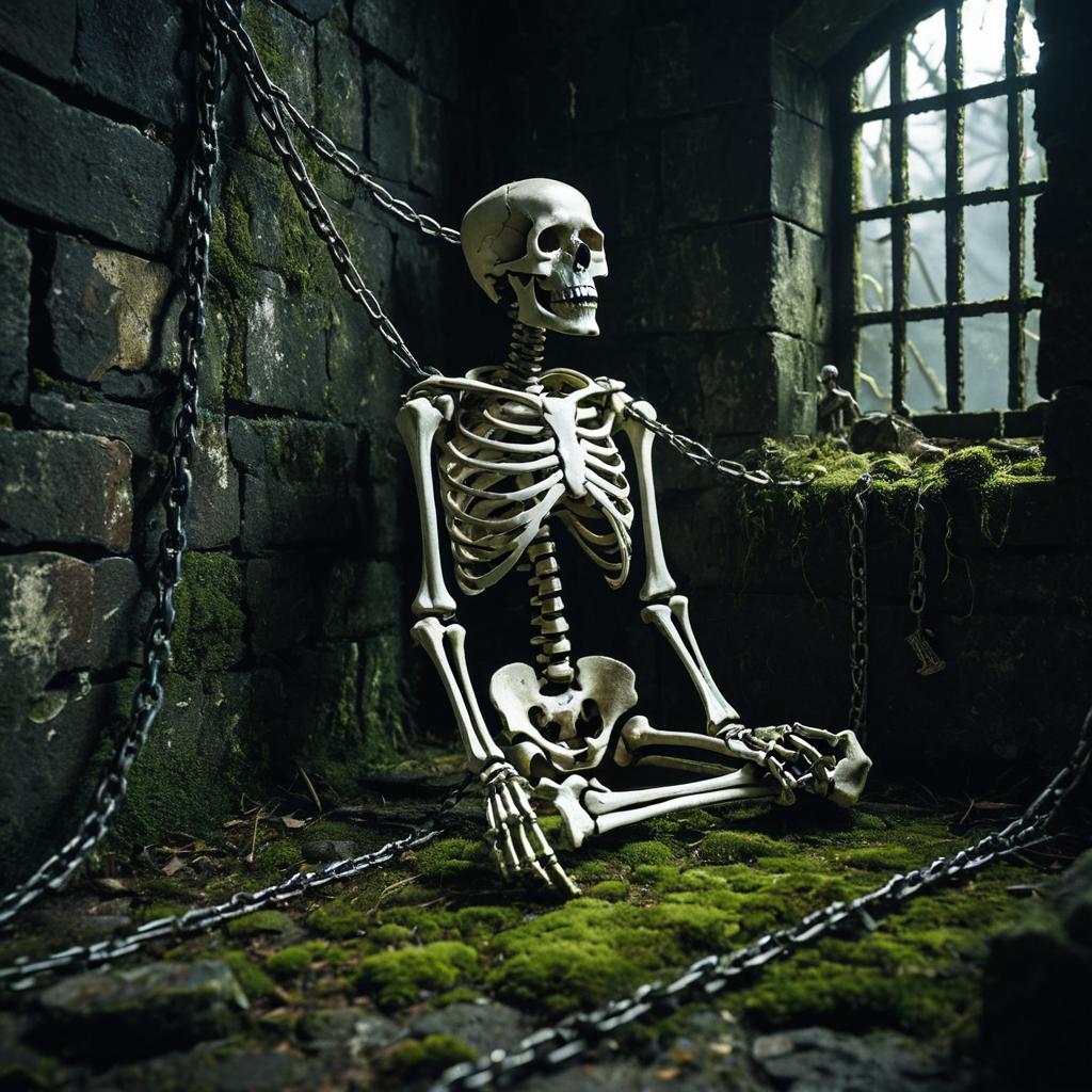 Digital art of a human skeleton chained to moss-covered stone walls inside an ancient dungeon or prison cell, illuminated by dramatic natural light through a barred window. The scene evokes a dark, mysterious, and abandoned atmosphere.
