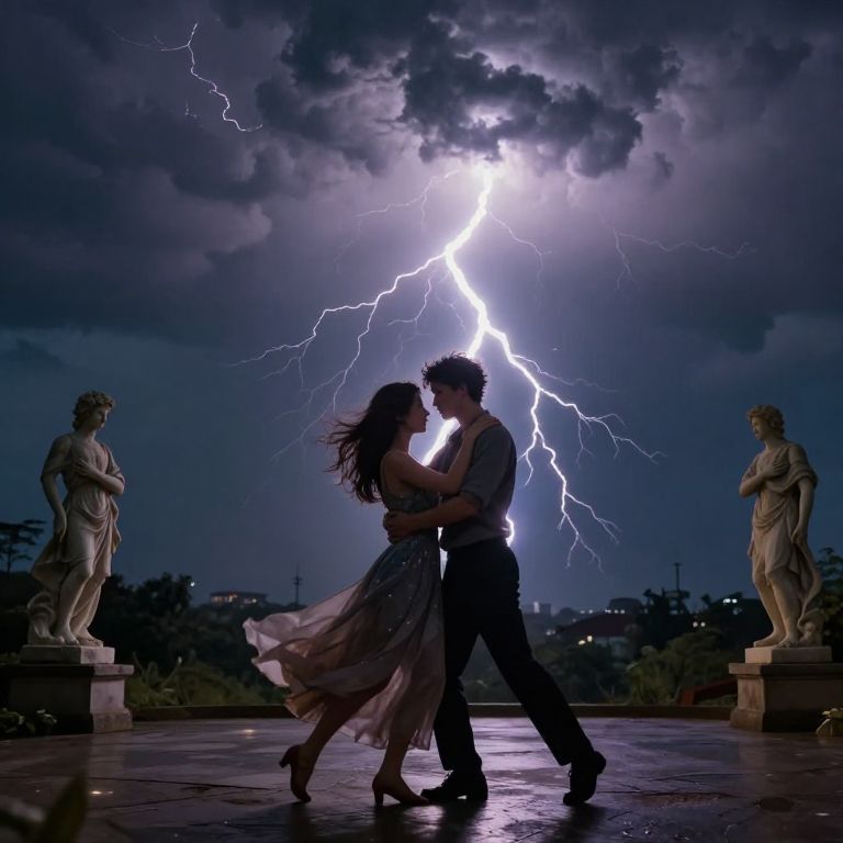 Amidst the electric pulse of a thunderstorm, two figures embrace in a tender dance, their movements mirroring the lightning's wild symphony, while statuesque observers stand as silent witnesses to the fleeting beauty of connection and the eternal rhythm of life.