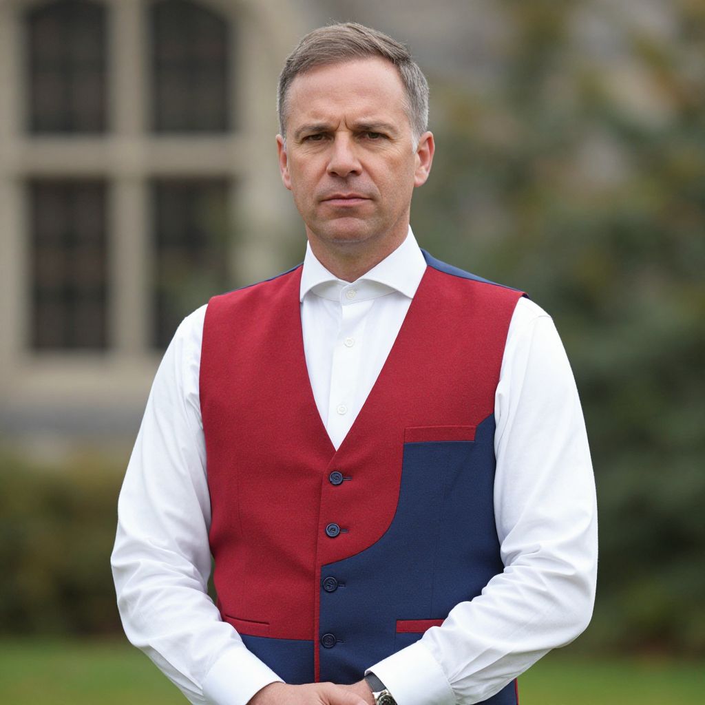 Man Regency, man in a red and blue vest and a white collared shirt
