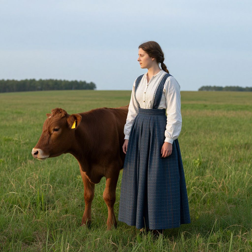 Serene Woman with Calf in Landscape