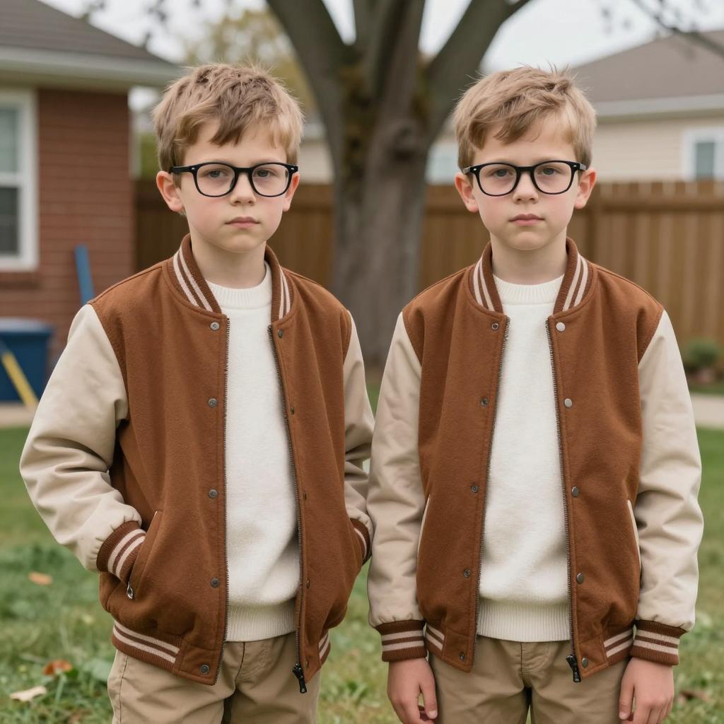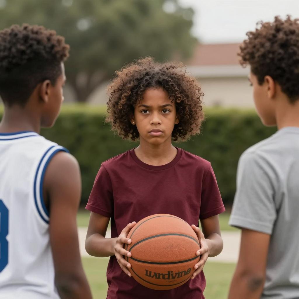 Group of six African American children and one white man in a park. Children wear black "Bam-Bam" shirts with green headbands, white long-sleeve shirts underneath. White man in black shirt and jacket stands behind them. Children walk in a line, smiling. Background includes trees, grass, and a brick building. Sunlight casts shadows. Children's expressions are happy, man's expression is neutral.