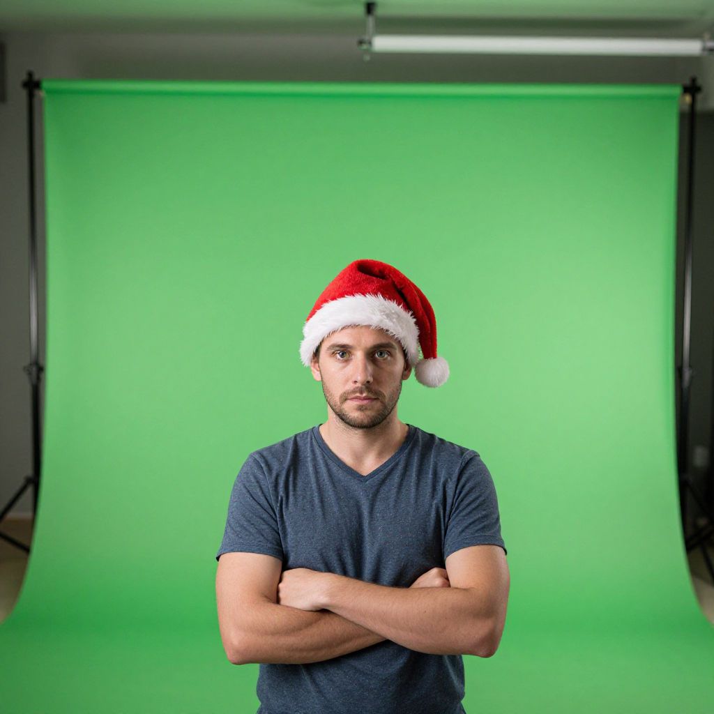 Imaginative composition: A man sporting a festive Santa hat stands confidently before a bright green chroma key background, bathed in soft natural light, with the entire scene captured in an expansive extreme wide angle view, emphasizing his figure against the vibrant backdrop. Man has masculine face and piercing eyes