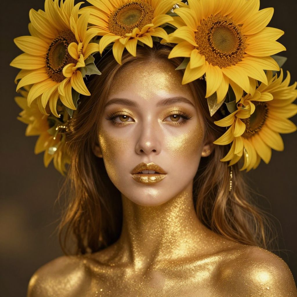 Photograph-like digital art of a golden-haired woman with sunflower crown, glittery gold face and shoulders, and intense gaze, set against a dark