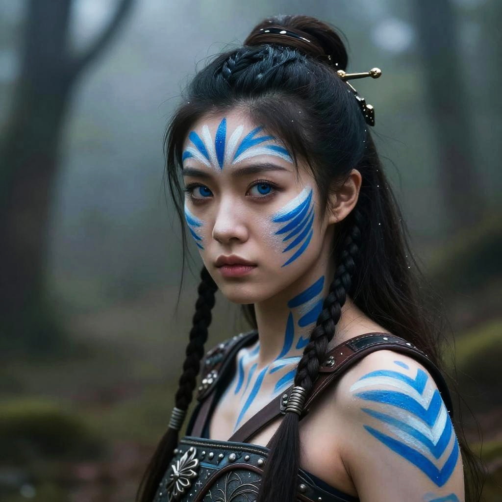 Portrait of a braveheart war paint adorned female warrior, tribal blue and white lines, piercing eyes, misty forest setting, ethereal and powerful atmosphere