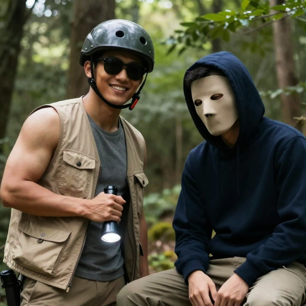 Two shirtless men in military helmets standing in front of a large, metallic, artillery gun with a face-like design. Both men smile; one on the left adjusts his helmet, while the other on the right rests his hand on his hip. Green forest in the background.