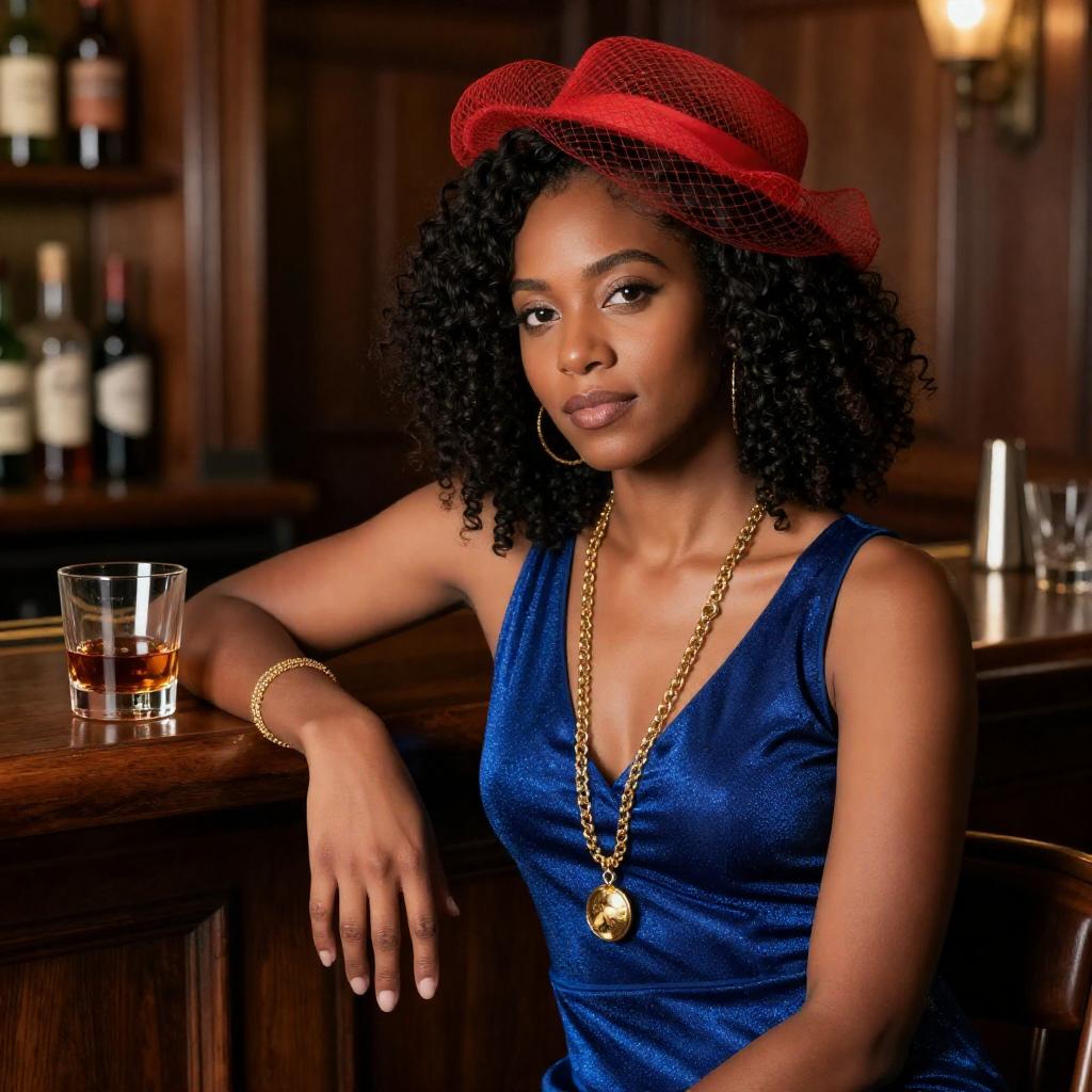 A highly detailed portrait of a young Black jazz singer holding a vintage microphone, wearing a sequined dress in the style of retro 1950s jazz club film photography, capturing a sultry, smoldering half-smile with smoky club atmosphere with warm art-deco lamps and vinyl records on a nearby table,