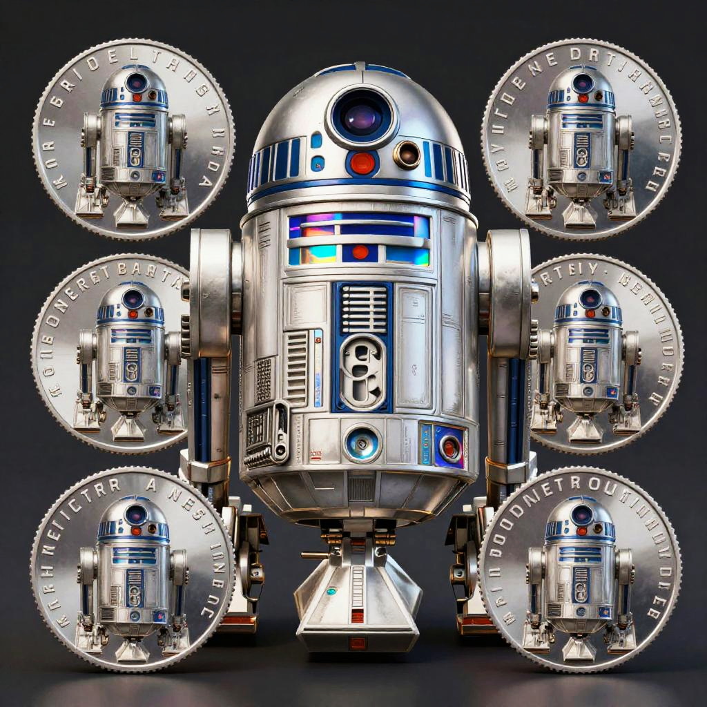 R2d2 quarters as a set of stylized silver coins with embedded holographic elements showing miniature droid animations, sci-fi tech aesthetic, dramatic lighting, ultra detailed digital painting